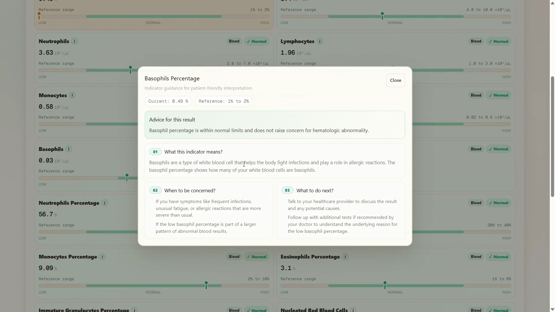 Indicator drill-down - Any individual indicator can be expanded to show what it measures, when the value is concerning, and what to do next. Responses are cached in memory.