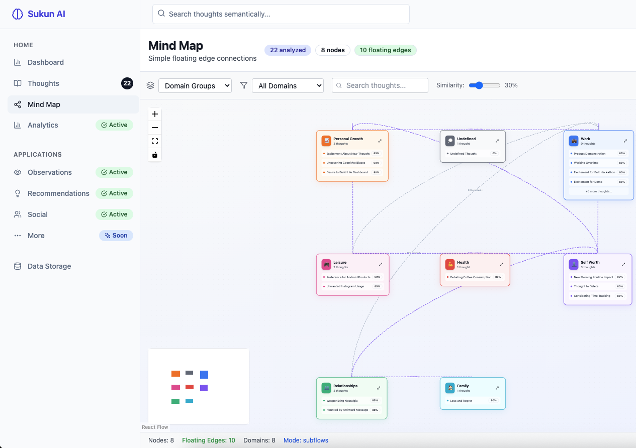Gathers users thoughts as a journal one at a time, and start creating a mind map with clusters and correlations.