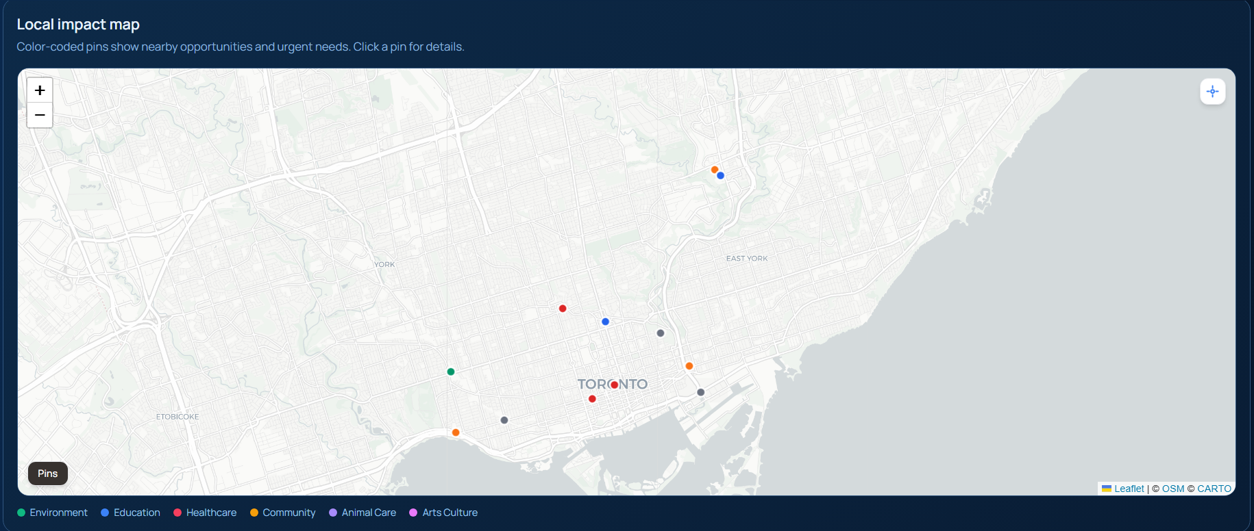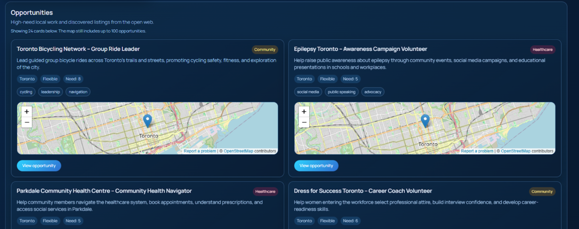Users fill out a form, outlining their interests after creating an account. They are then able to access a dashboard of opportunities found on the internet on our centralized platform. These opportunities are organized based on our recommendation engine, that orders the most aligned opportunities from top to bottom. Users are also able to see a simple geographical location of the volunteering event/opportunity, allowing them to consider their distance, and commute.