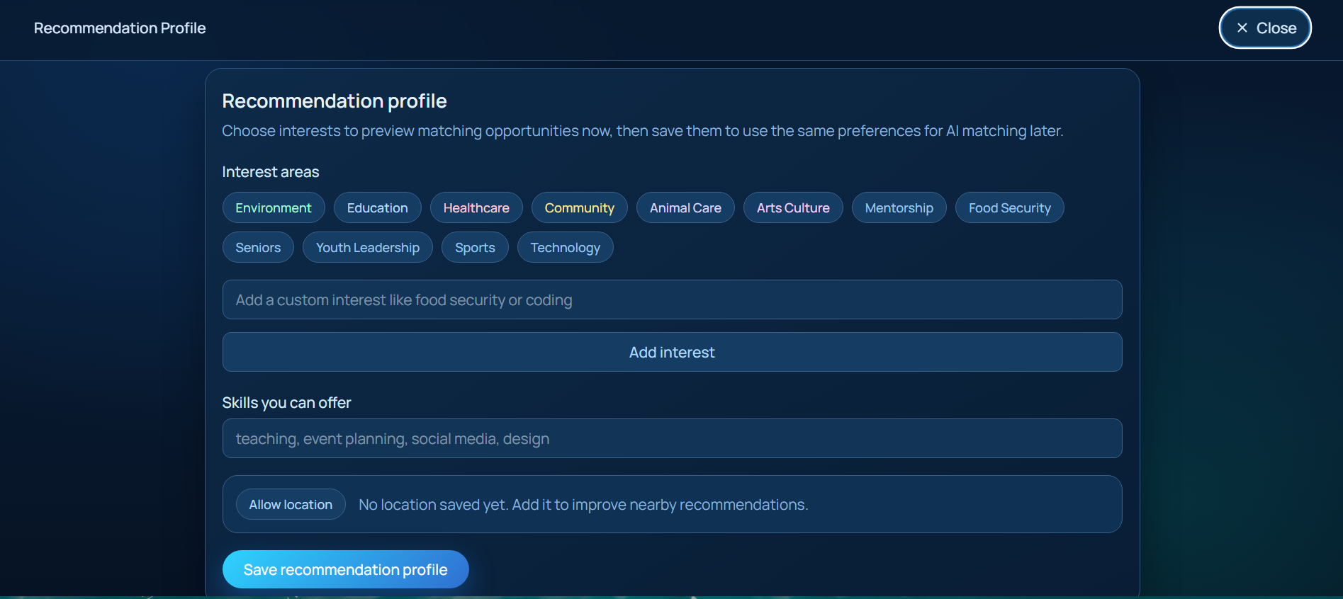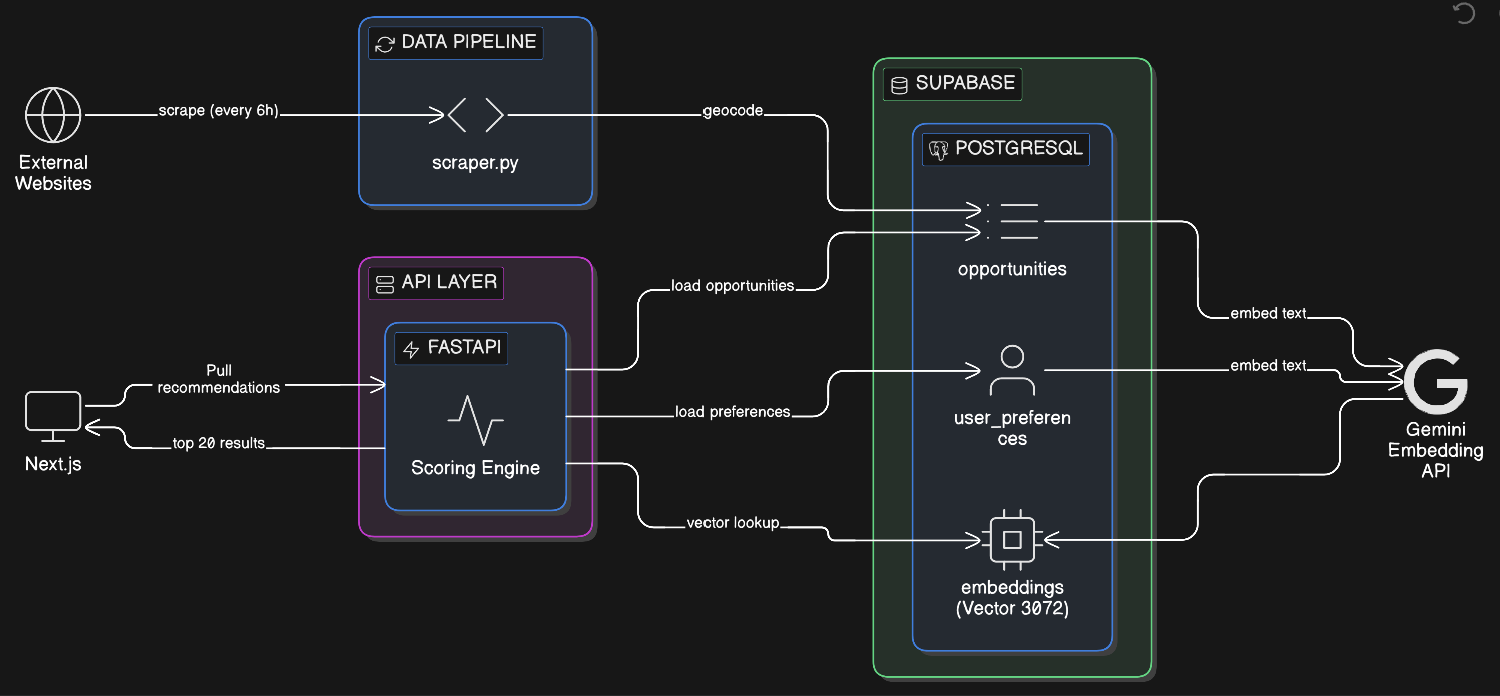 Our recommendation engine uses Google Gemini's embedding model to convert both user profiles and volunteer opportunities into 3,072-dimensional semantic vectors stored in our PostgreSQL database via pgvector. At query time, the engine computes a weighted score for every opportunity — combining cosine vector similarity (36%), interest token overlap (22%), skill overlap (16%), proximity via Haversine distance (10%), cause category match (8%), volunteer demand (5%), and event recency (3%) — then returns the top-ranked results with a plain-English explanation of why each opportunity matches the user. A Celery beat scheduler scrapes new listings every six hours, geocodes their addresses via Mapbox, and lazily generates embeddings for any new entries so the recommendations stay fresh.