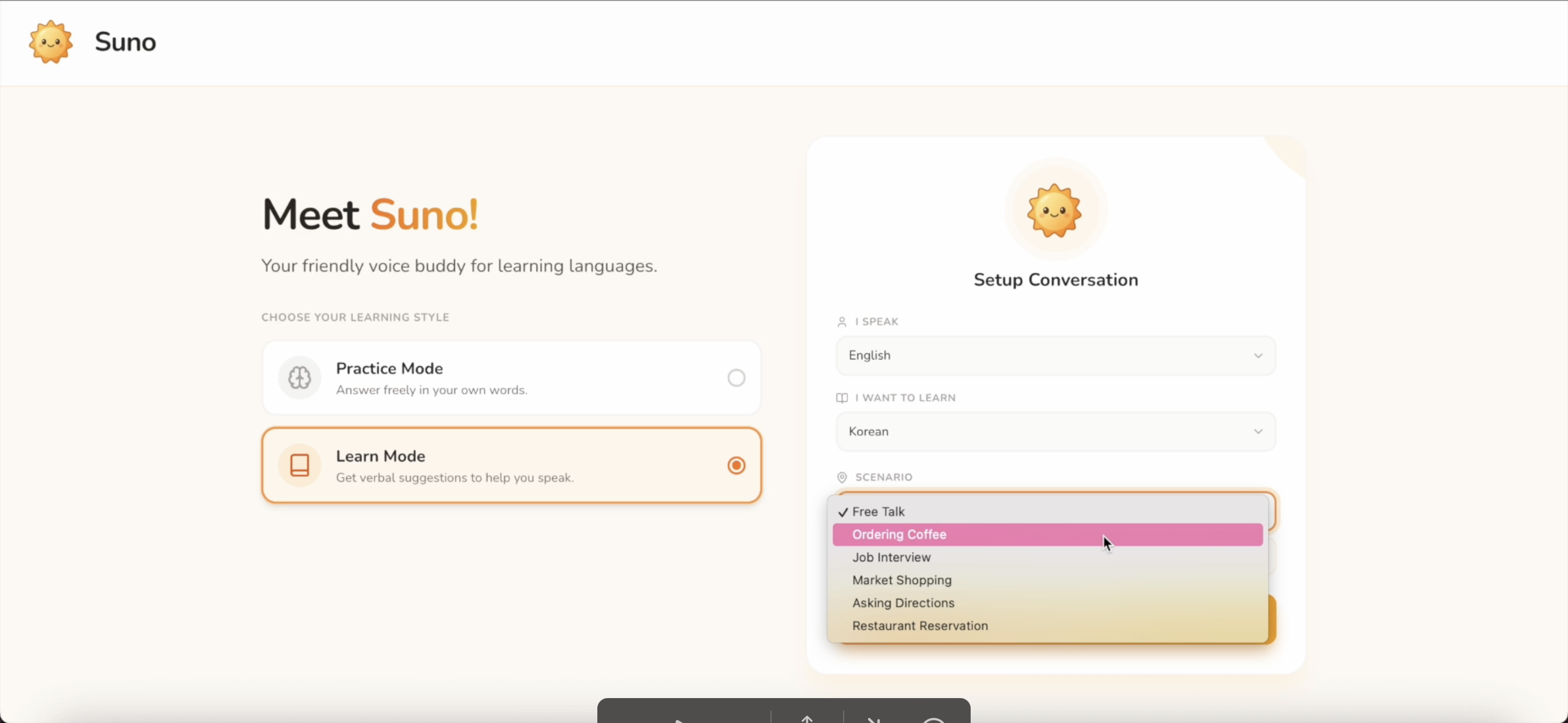 Welcome to Suno! Voice-first language companion built to help you learn by speaking!