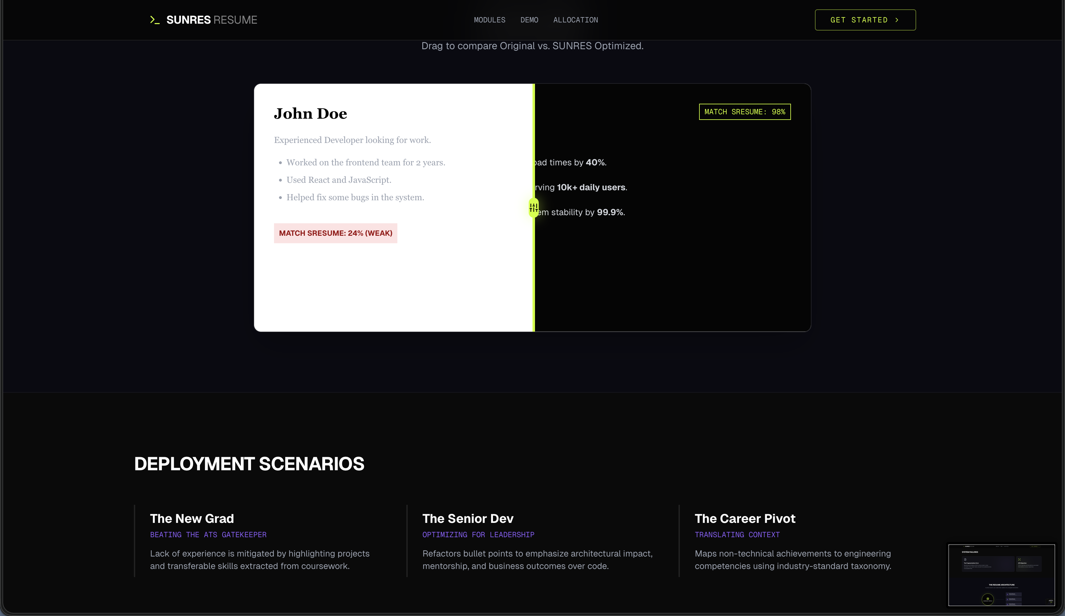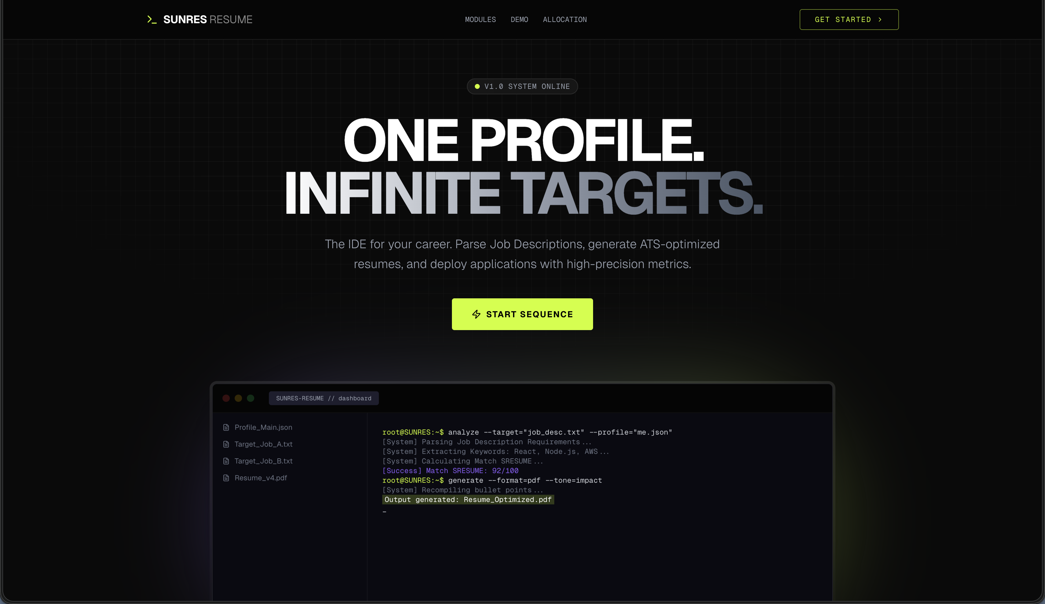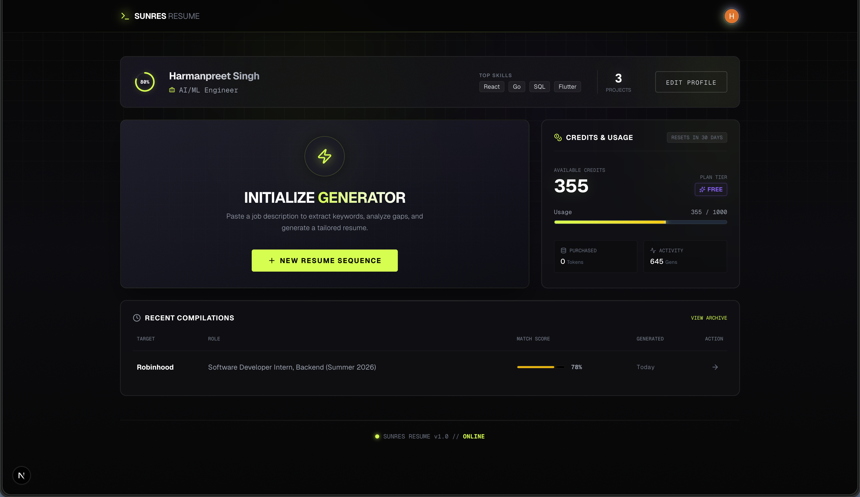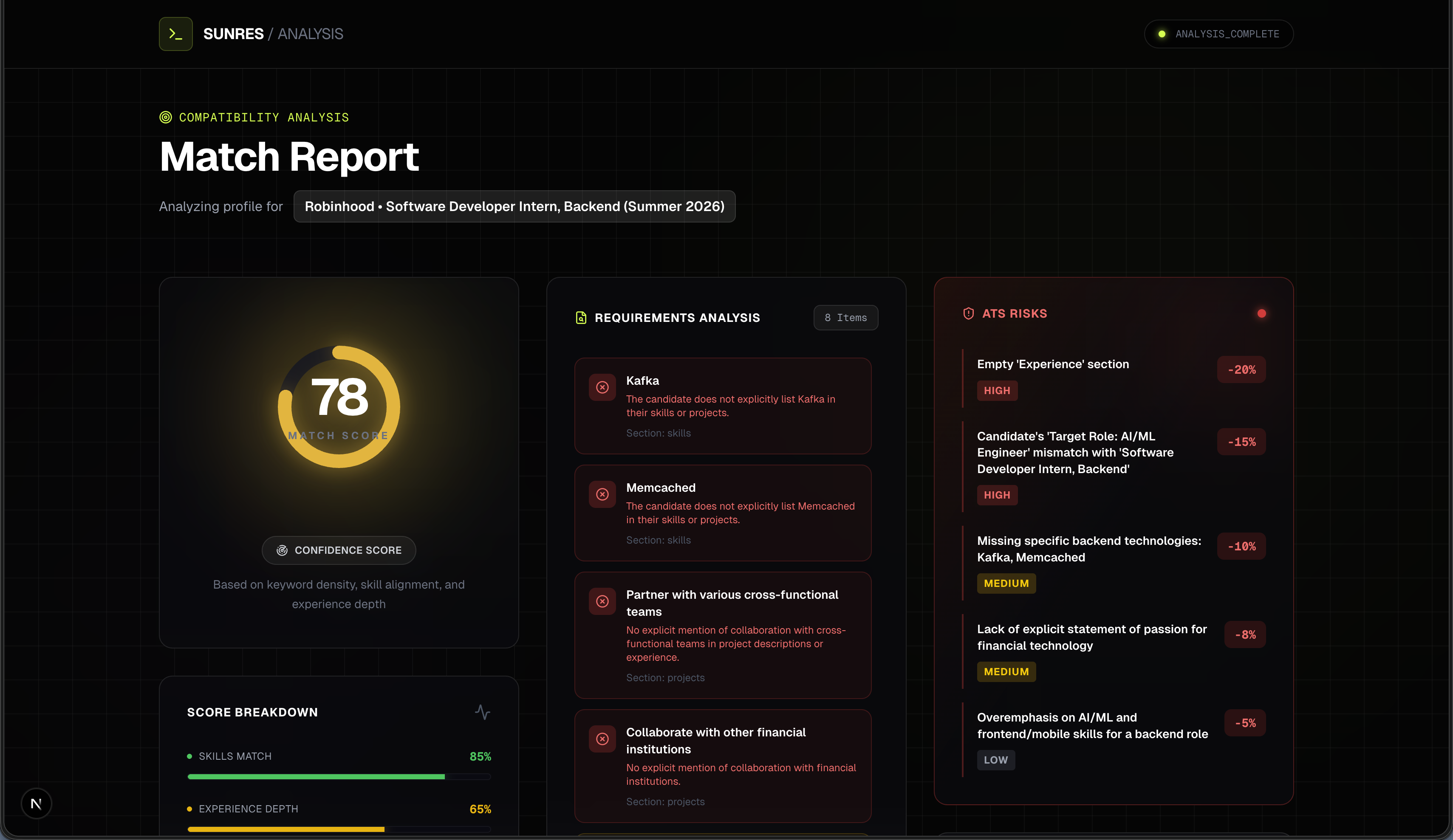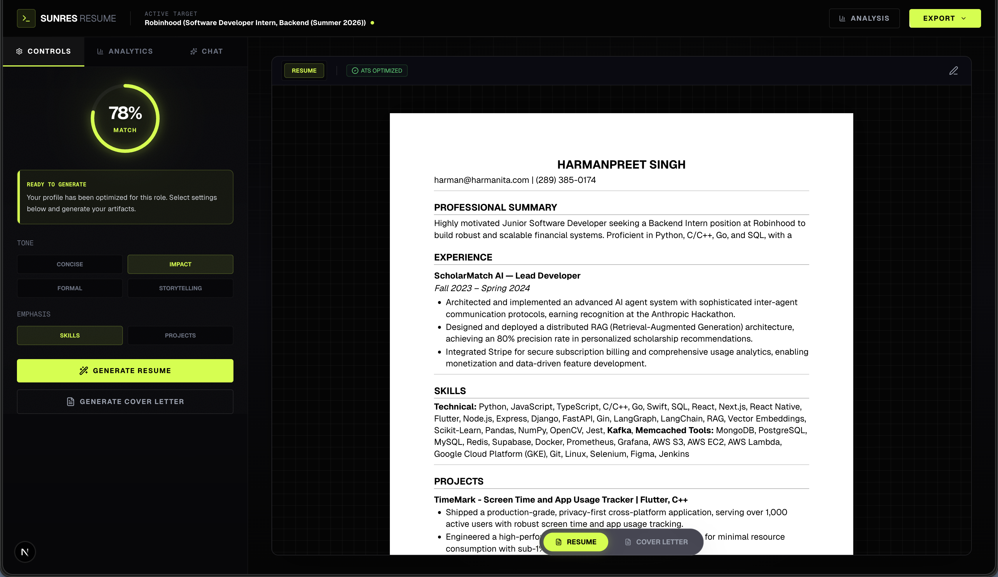 SunRes helps users get closer to their dream job interview by analyzing how well their profile matches a job posting and generating a tailored resume and cover letter.