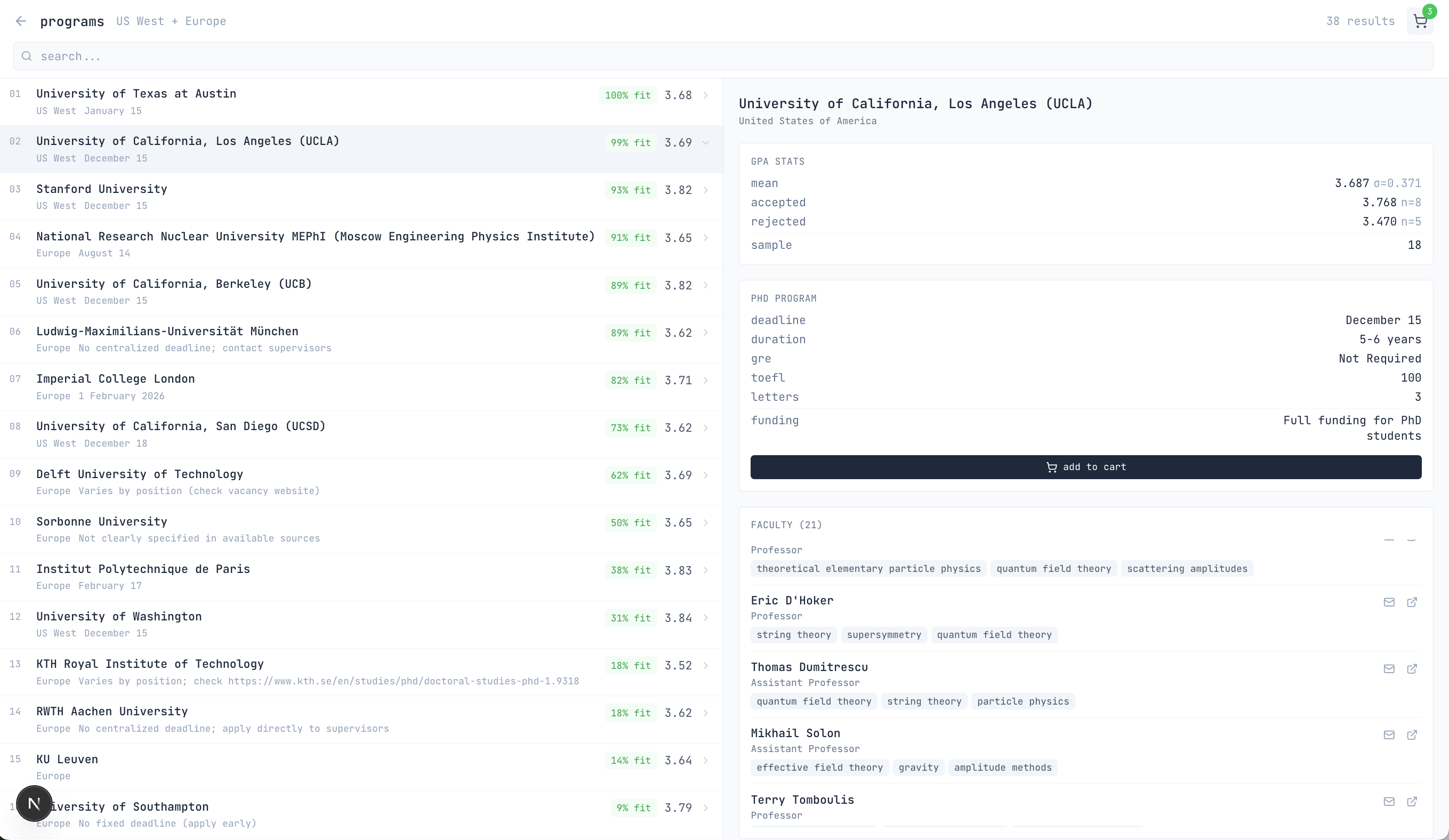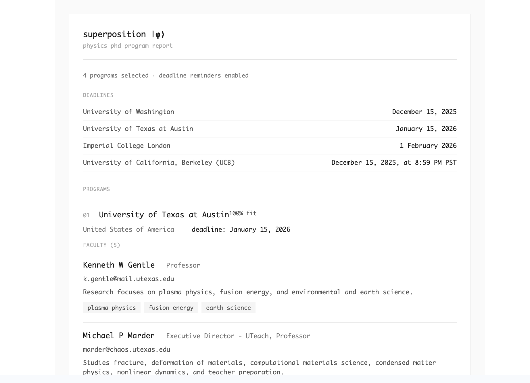 superposition \( \vert \phi \rangle \) leans on data from over 100 graduate programs, taken from their admissions and physics faculty websites, and imports knowledge from Gradcafe. It's written in Typescript and Python using Nextjs.