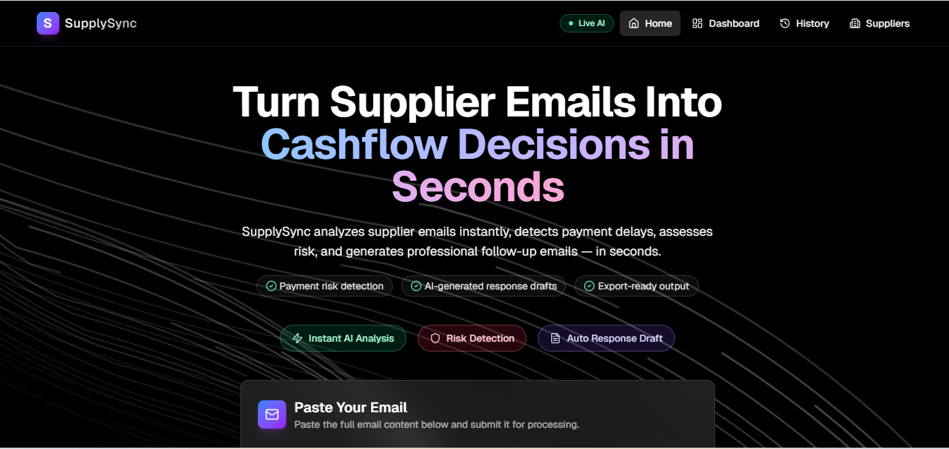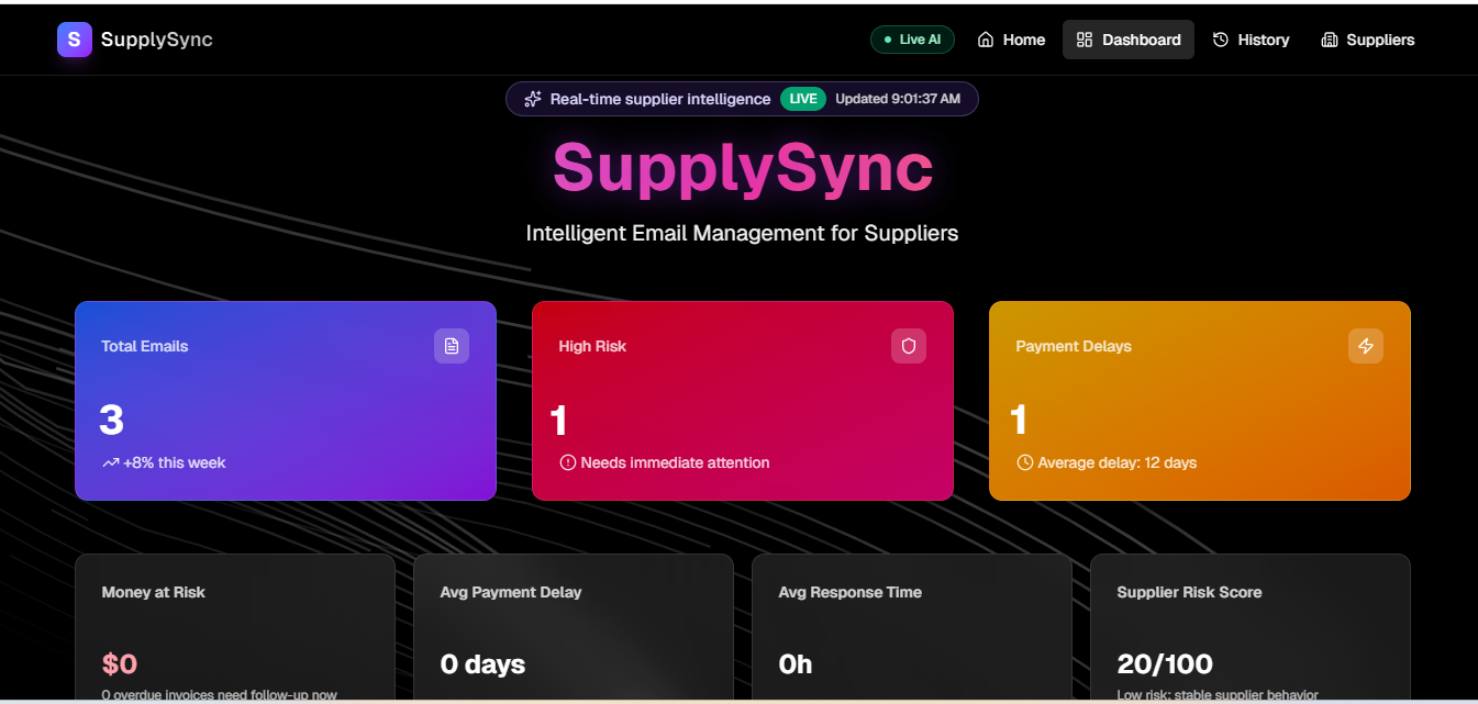 Inspiration Small suppliers are the backbone of global supply chains, yet completely underserved by technology. A family member who runs a small manufacturing business inspired this project — watching them spend hours manually reading emails from large corporations, tracking payment deadlines, and writing follow-up letters. One missed email cost them weeks of delayed payment and $5,400 in lost cashflow. I built SupplySync to give small suppliers the same intelligence that large enterprises have.