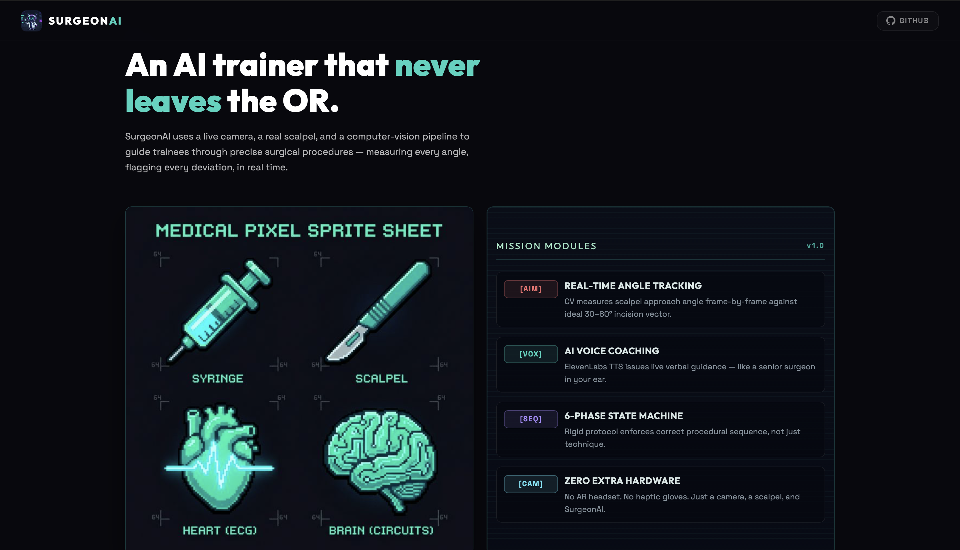 What it does The platform uses a standard webcam to track a trainee's scalpel in real time, instantly providing AI-generated voice coaching if their approach angle deviates from the optimal safe zone.