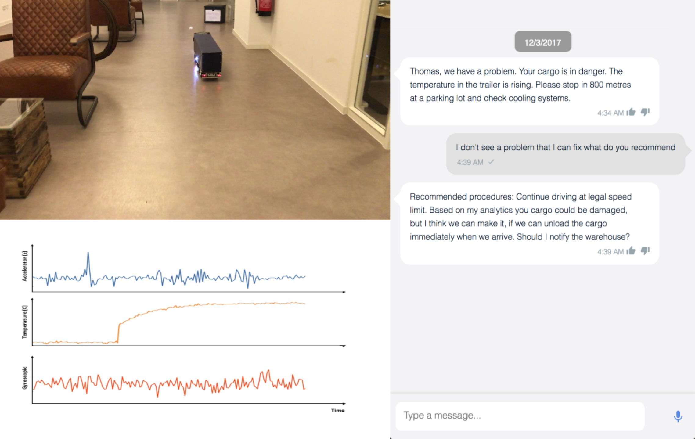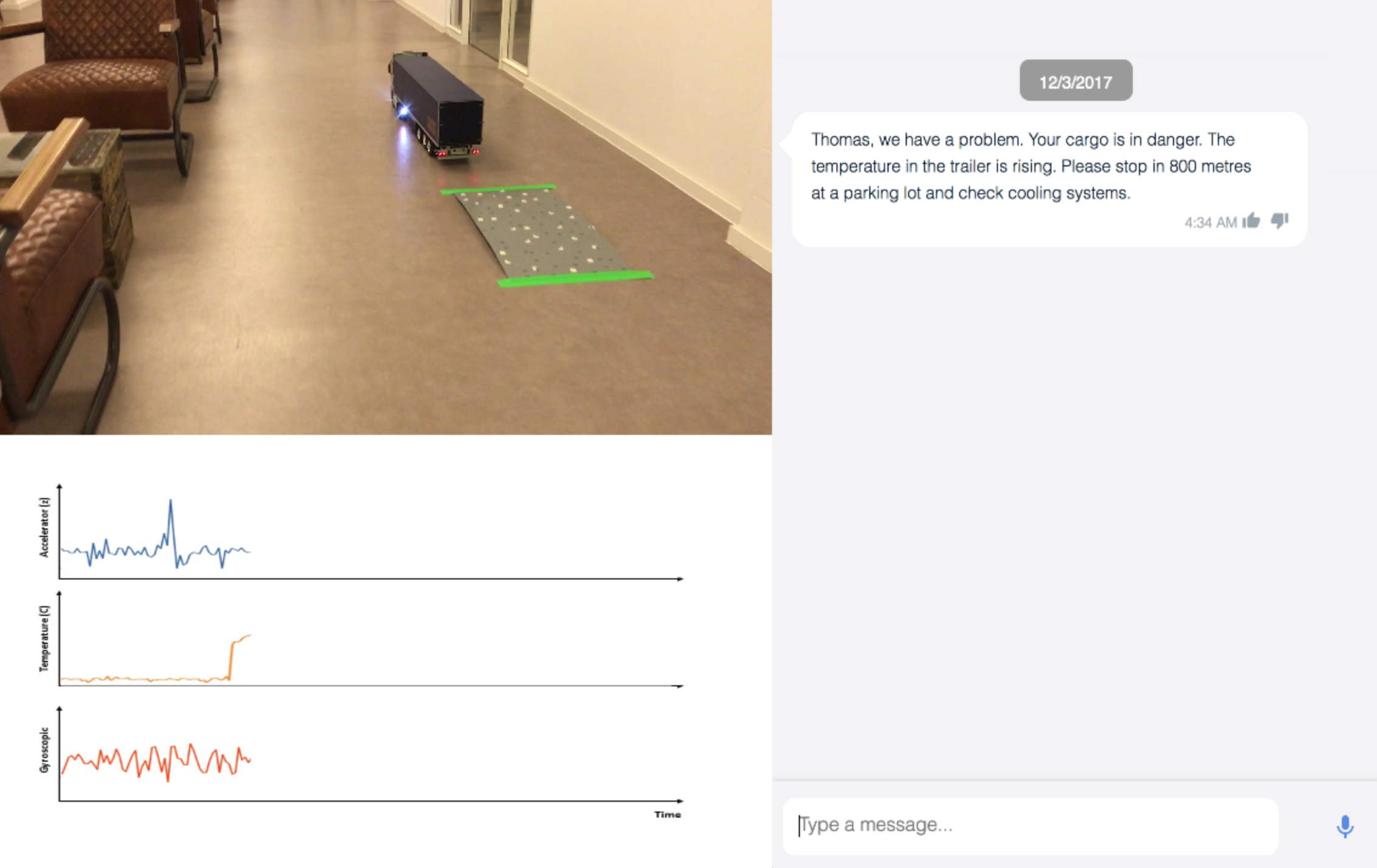 Truck assistant supports drivers in crucial decisions. It provides an interface truck drivers can talk to. Imagine a truck driver is on the road and something happens. Our AI will give him guidance for decisions and feedback. In the scenario our truck assistant, the computer, helped the driver, a human, to solve a problem. The company manages to inform the warehouse to prepare the unload the medical goods and advance the truck in the delivery line. Despite technical problems of a broken cooling system the goods could be saved and were delivered successfully.