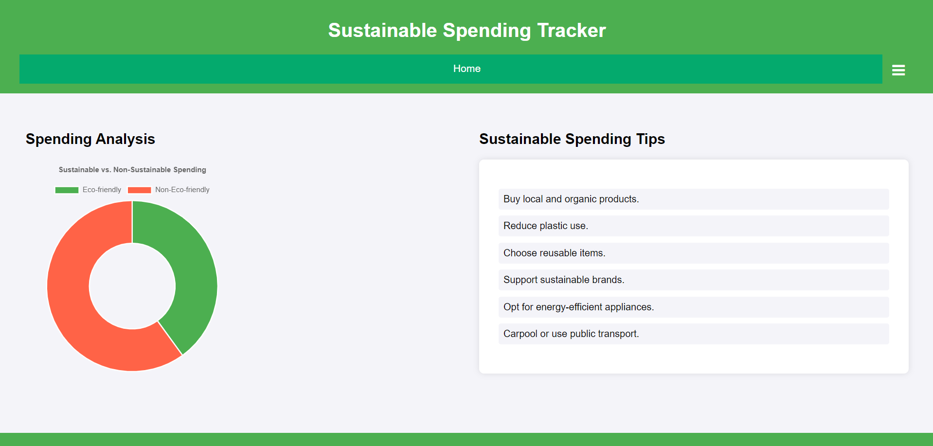 - Sustainable Spending Tracker: Categorizes spending into eco-friendly and non-eco-friendly categories, providing suggestions for more sustainable alternatives.