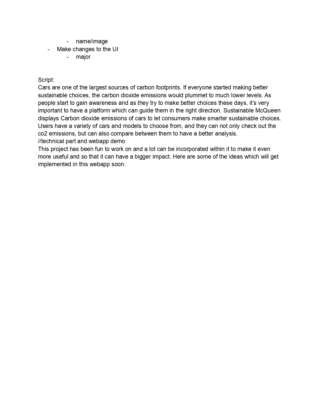 Sleep. After that, we plan on utilizing Catalog and delivery APIs to create a one-stop shop where end users can not only make a decision but also take the decision. Furthermore, we wish to add other ways cars affect the environment into consideration. Adding a price filter along with an emission filter, which can allow users to search for an optimum solution that is not only sustainable but also within their budget.