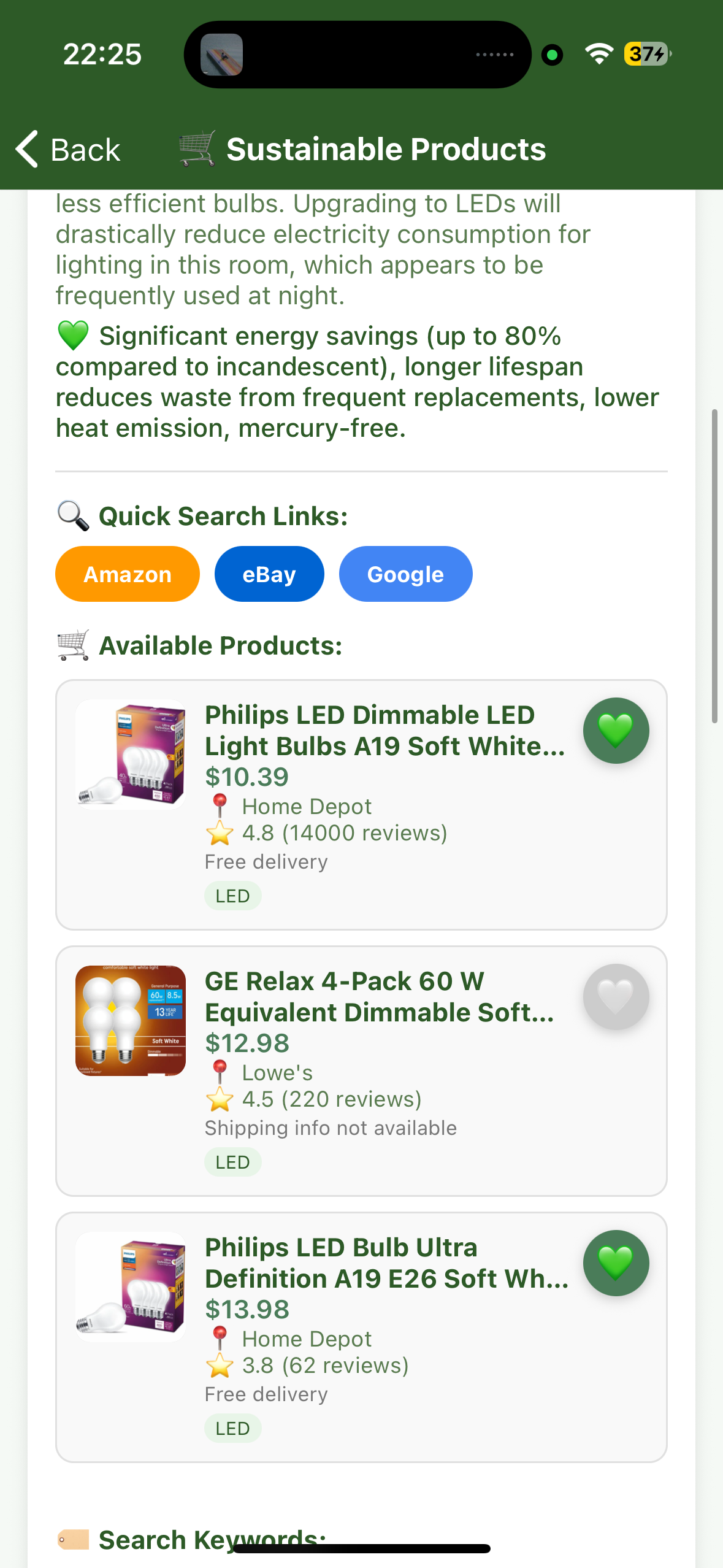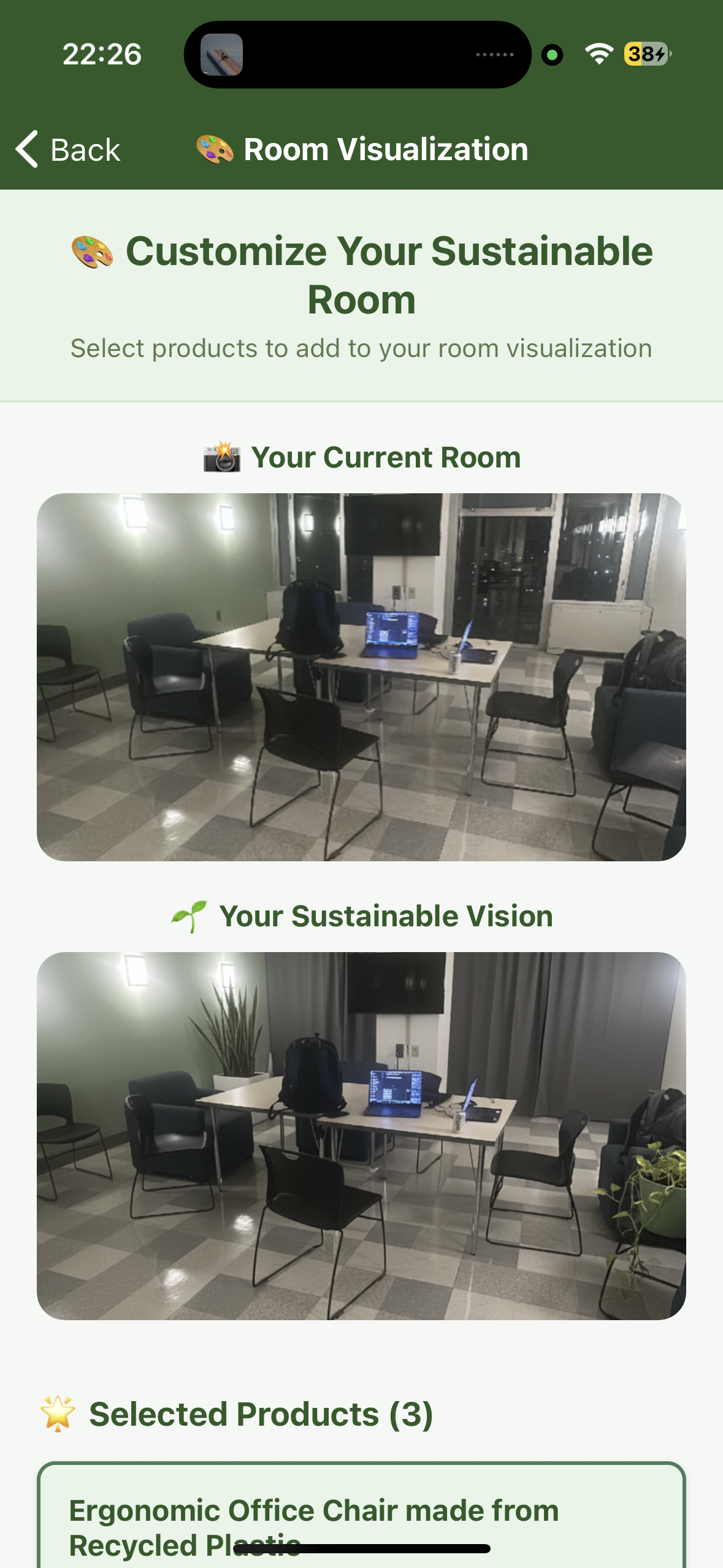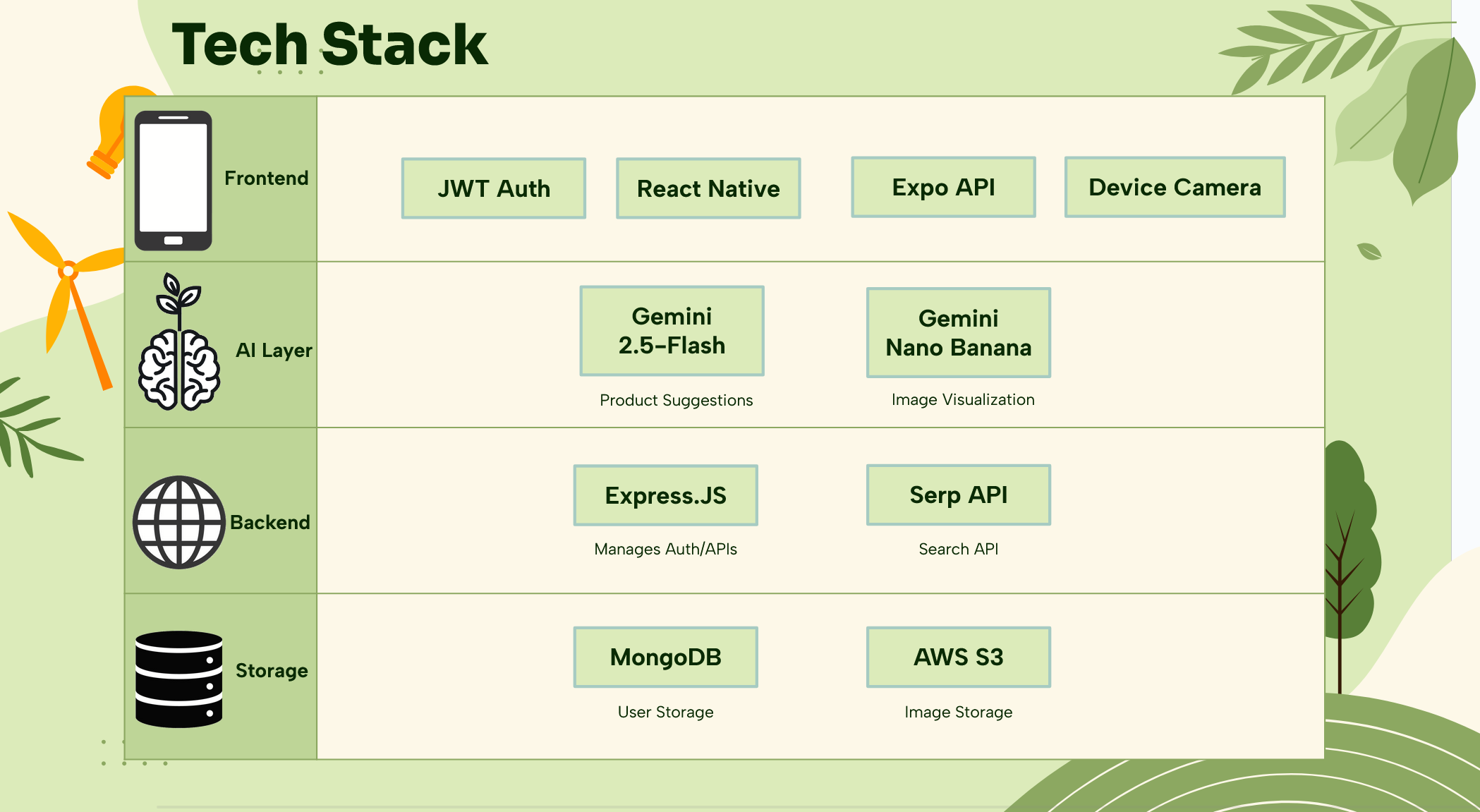 We implemented a sophisticated two-stage Gemini AI pipeline that first analyzes room photos to generate structured JSON data with sustainability scores and eco-friendly product recommendations, then feeds this data along with the original image into Gemini's image generation model to create realistic before/after visualizations of the sustainable room makeover. The mobile app was built using React Native and Expo for cross-platform compatibility, with a Node.js/Express backend handling user authentication via JWT tokens. Images are securely stored in AWS S3 with signed URLs, while user data, wishlists, product information, and signed URL image links are managed through MongoDB Atlas. We integrated SerpAPI / Google Shopping API for real-time product search and price comparisons across multiple retailers.