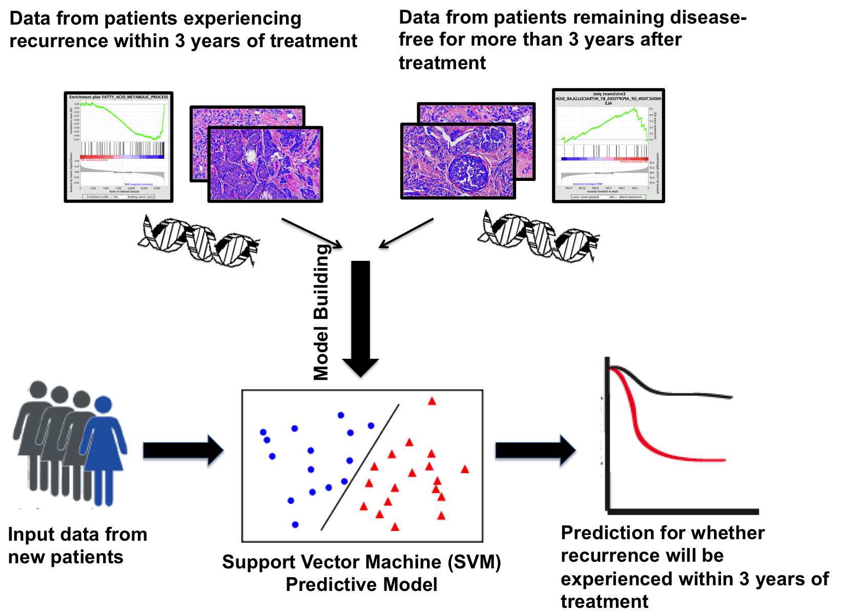 I used support vector machines (SVM) to develop a machine learning model that accurately predicts whether a breast cancer patient is likely to experience a recurrence after treatment. The prognosis method examines the patient's biopsy slide image with computer vision and leverages complex statistical methods to analyze the expression values of thousands of genes.
