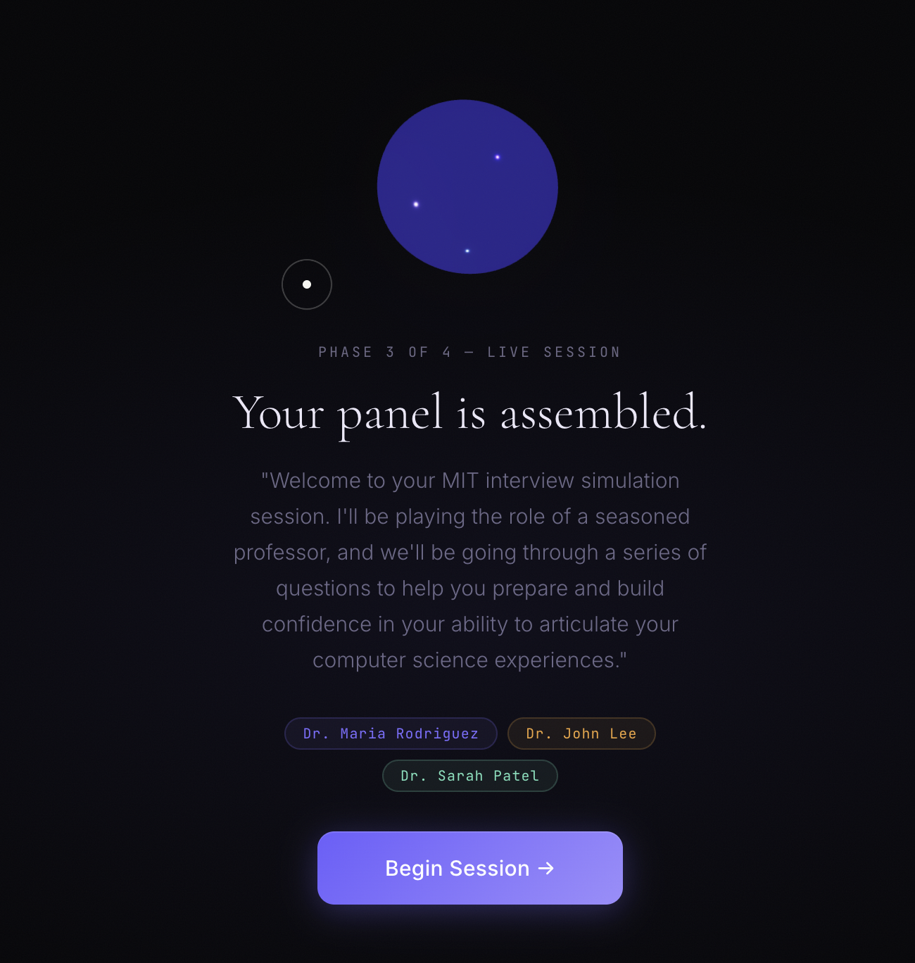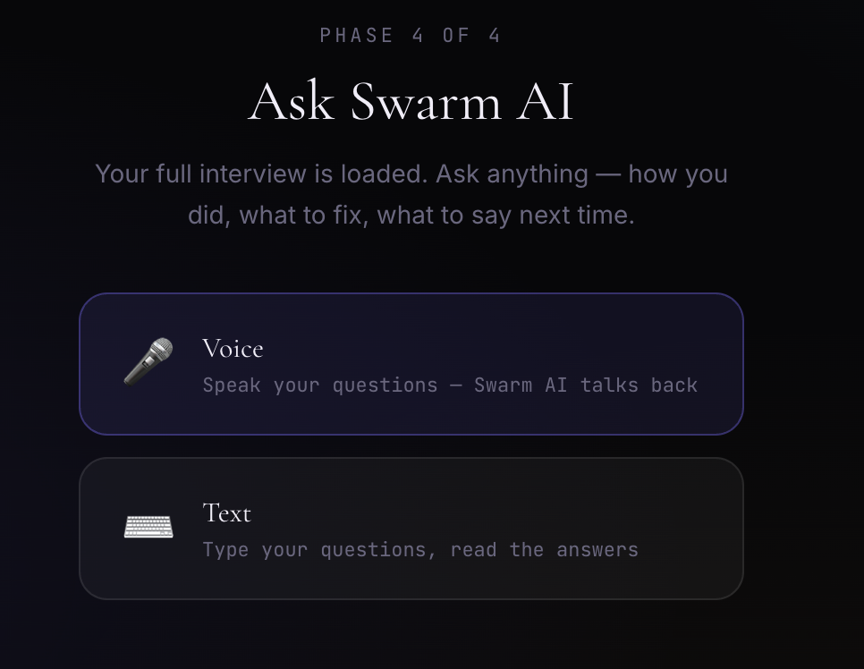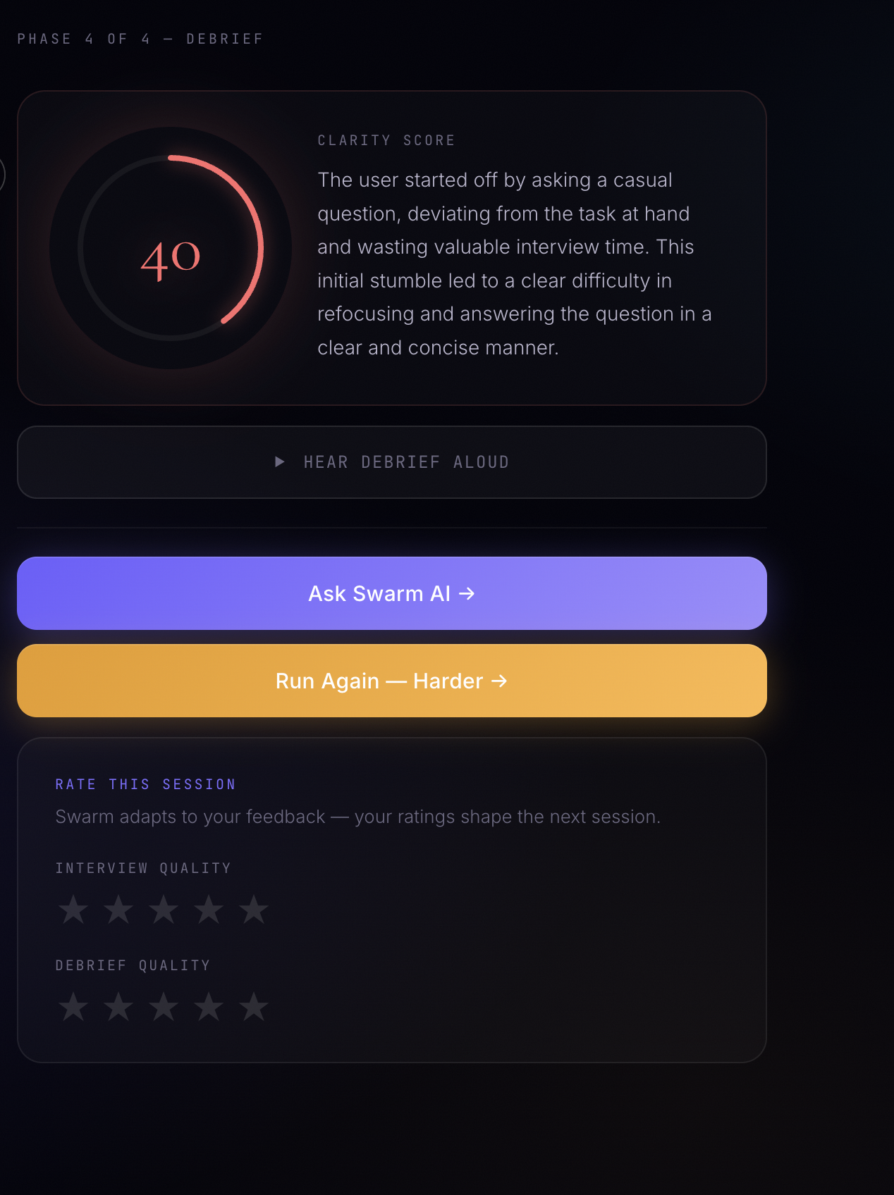 Swarm AI launches right afteryou describe your situation. Whether it be an emotional conversation with loved ones, a pannel interview for a Fortune 500, or a high-stakes VC pitch, Swarm spins up 5 specialized AI research agents in paralle, gives each generated persona a distinct and matching ElevenLabs voice, and runs a live spoken practice session like you're literally joining the real life video call. It then ends with a cinematic, detailed, and voice-powered debrief where it provides feedback and an overall clarity score, but also an option for users to ask Swarm AI about their interview. Swarm AI is trained on the entire context of what happened during the interview, and is ready to answer any questions with feedback to boost performance for the next time. On top of this, Swarm AI has a dashboard where you can also take a look at your past sessions/interview history and learn from charge forward even stronger.