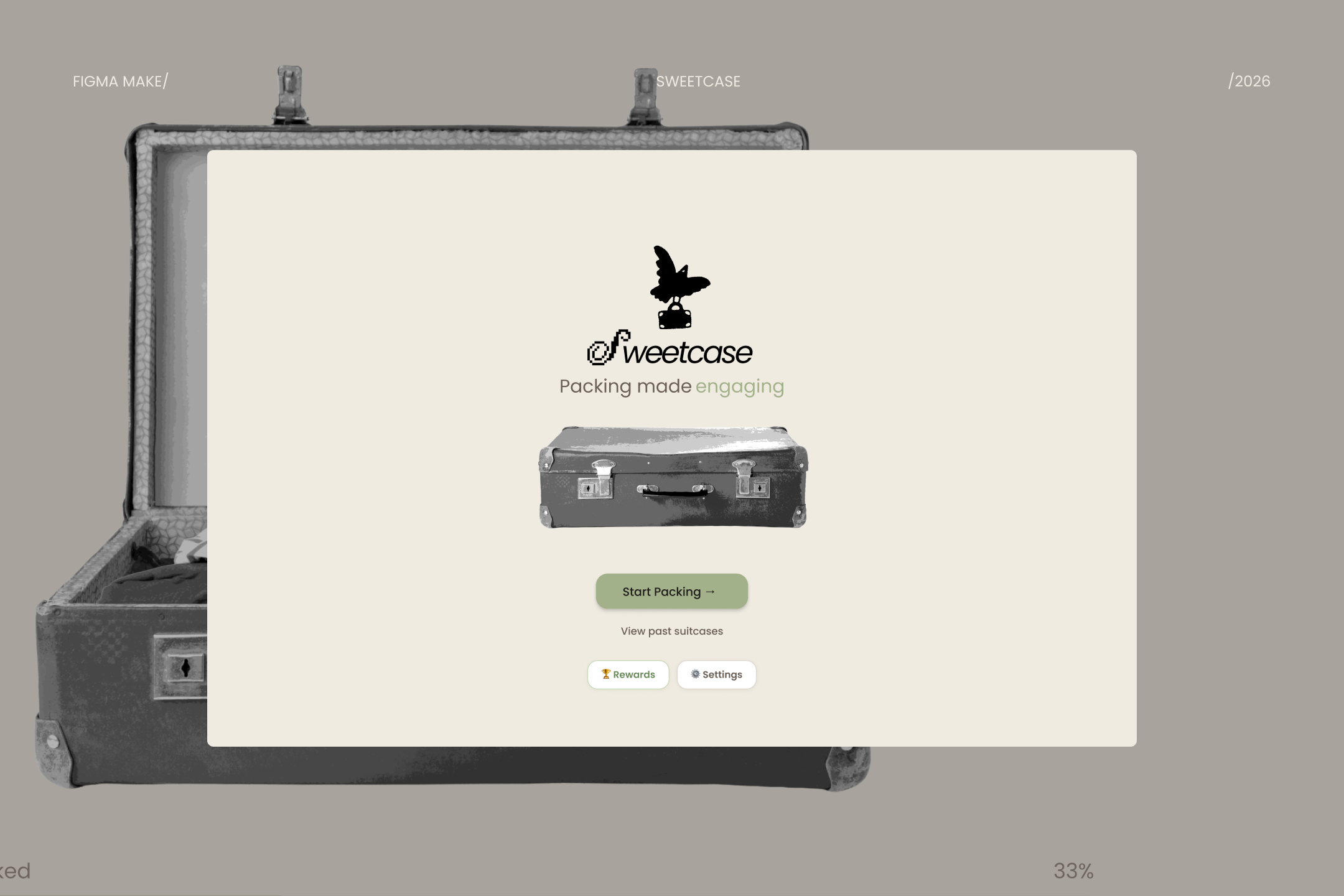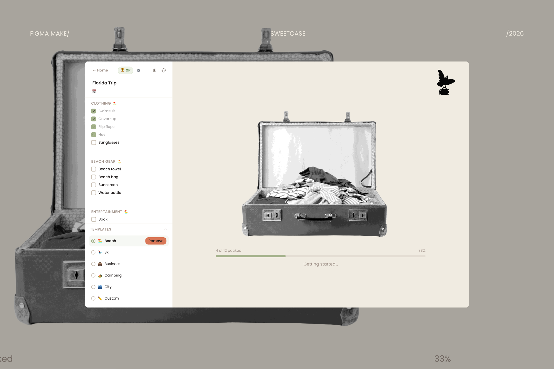 Sweetcase is a visual and interactive packing list. It reimagines static, over-optimized packing lists into an interactive design that encourages users to start packing through adaptive suitcase, templates, packing progress, and counts down days until time of departure.