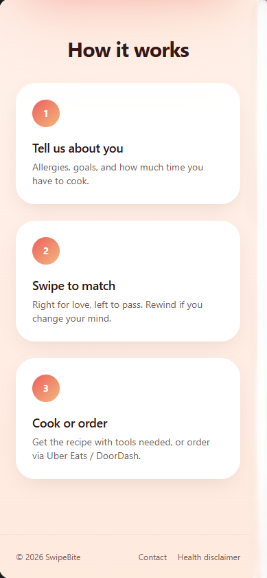 Swipe Bite is a hyper-personalized meal discovery platform. Users create a profile detailing their health goals (such as managing diabetes or following a pregnancy-safe diet) and lifestyle constraints.