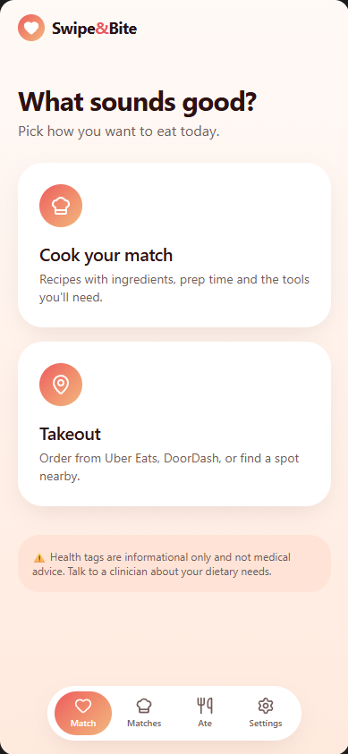 Every day, millions of people stare at their fridges or scroll through delivery apps with "decision fatigue." We wanted to turn that chore into a "spark." By borrowing the UI/UX of Tinder and Bumble, Swipe Bite removes the stress of choice and replaces it with a romance-themed discovery engine. It’s not just about eating; it’s about finding "The One". Whether that’s a home-cooked Mediterranean bowl or a local Thai takeout.