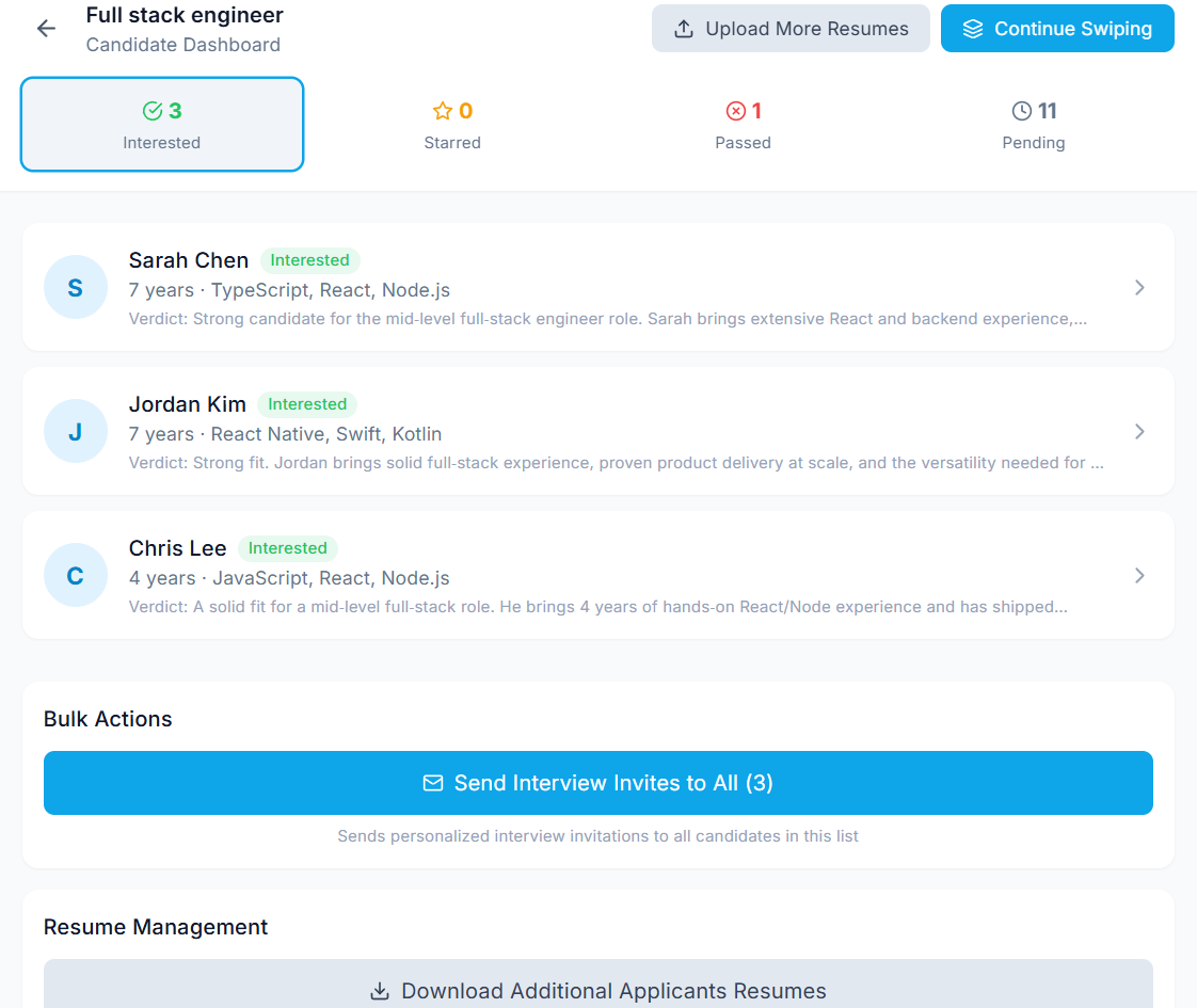 Swipe right to express interest. Swipe left to pass. Star candidates you want to revisit later. It's that simple.