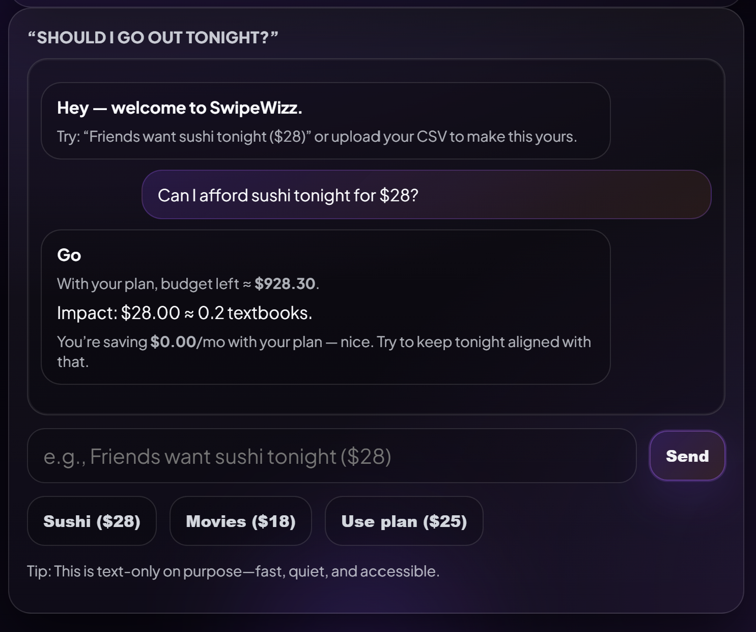 SwipeWizz encourages informed trade-offs rather than restrictive sacrifices. Our goal isn’t to eliminate the small joys of college life, but to give students clarity, perspective, and control over the financial future they are building today.