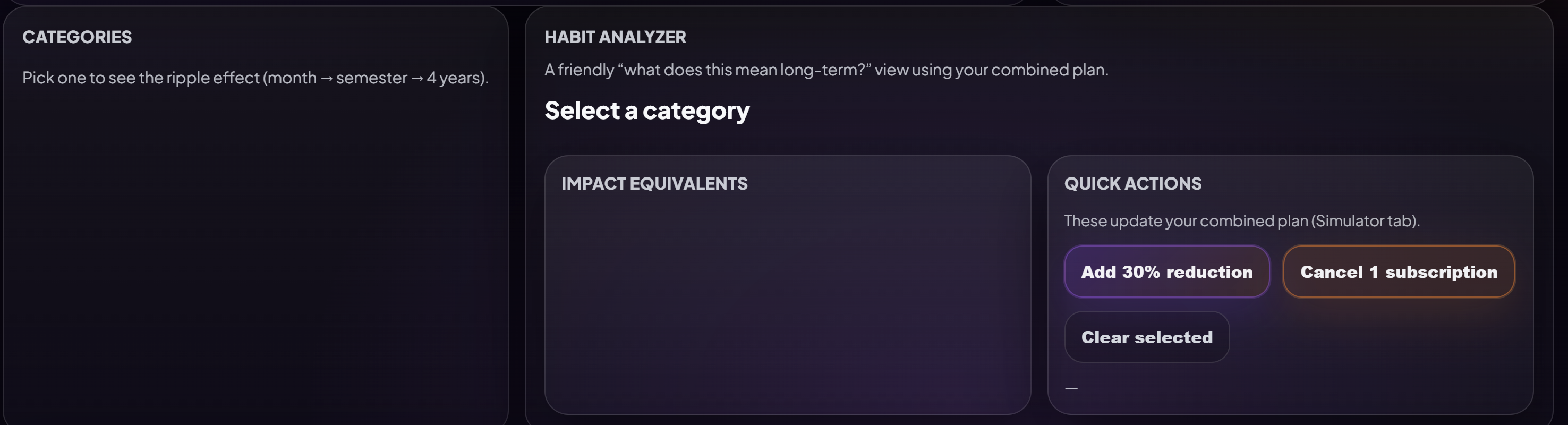 - Interactive Simulator – Model changes and see projected savings, framed as helpful milestones like rent, trips, loans, or first apartment deposits.