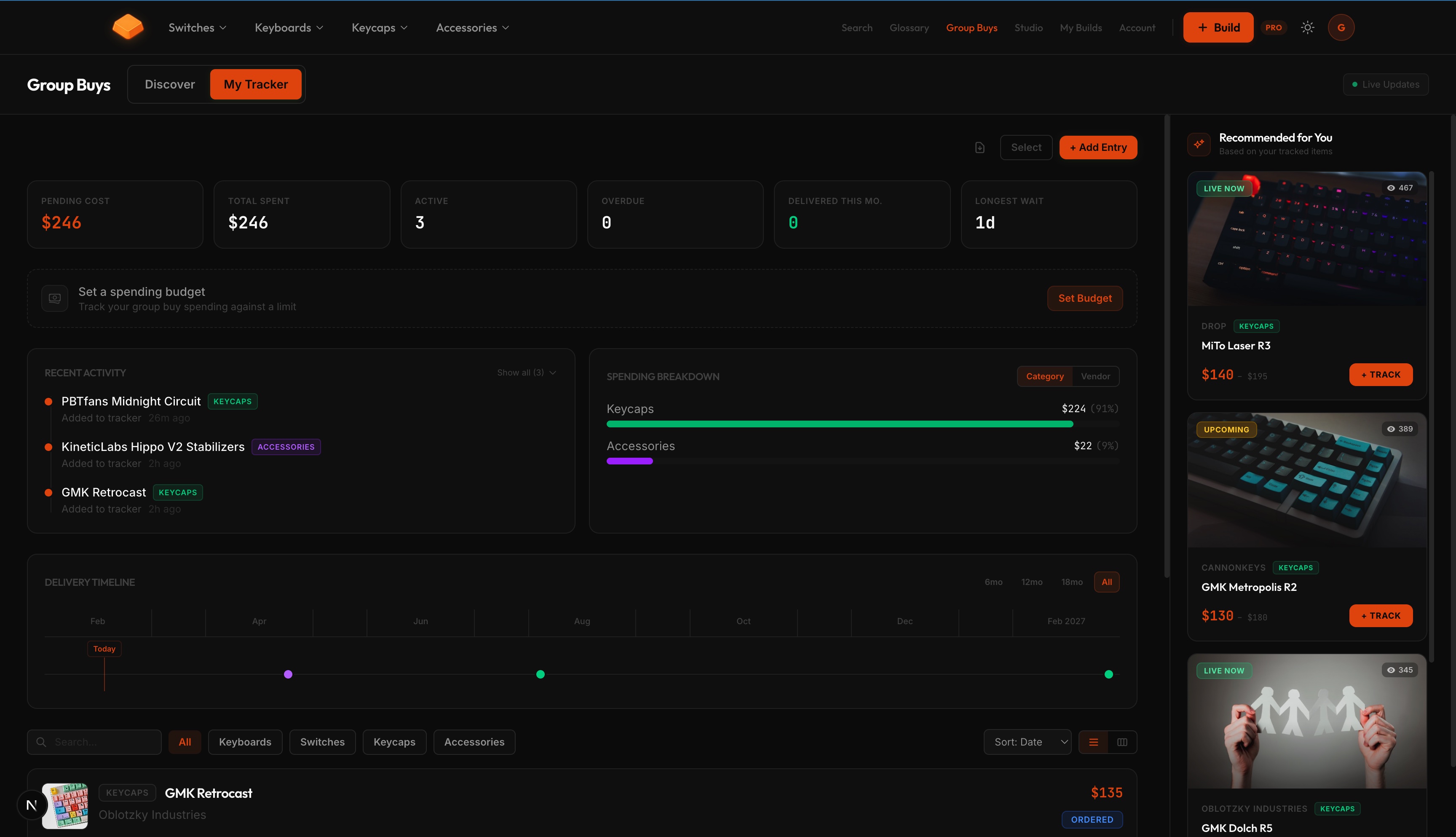 Database of 250+ real products: Cataloged 120 switches, 40 keyboards, 30 keycap sets, 60+ accessories, all with accurate specs, compatibility data, and vendor links.