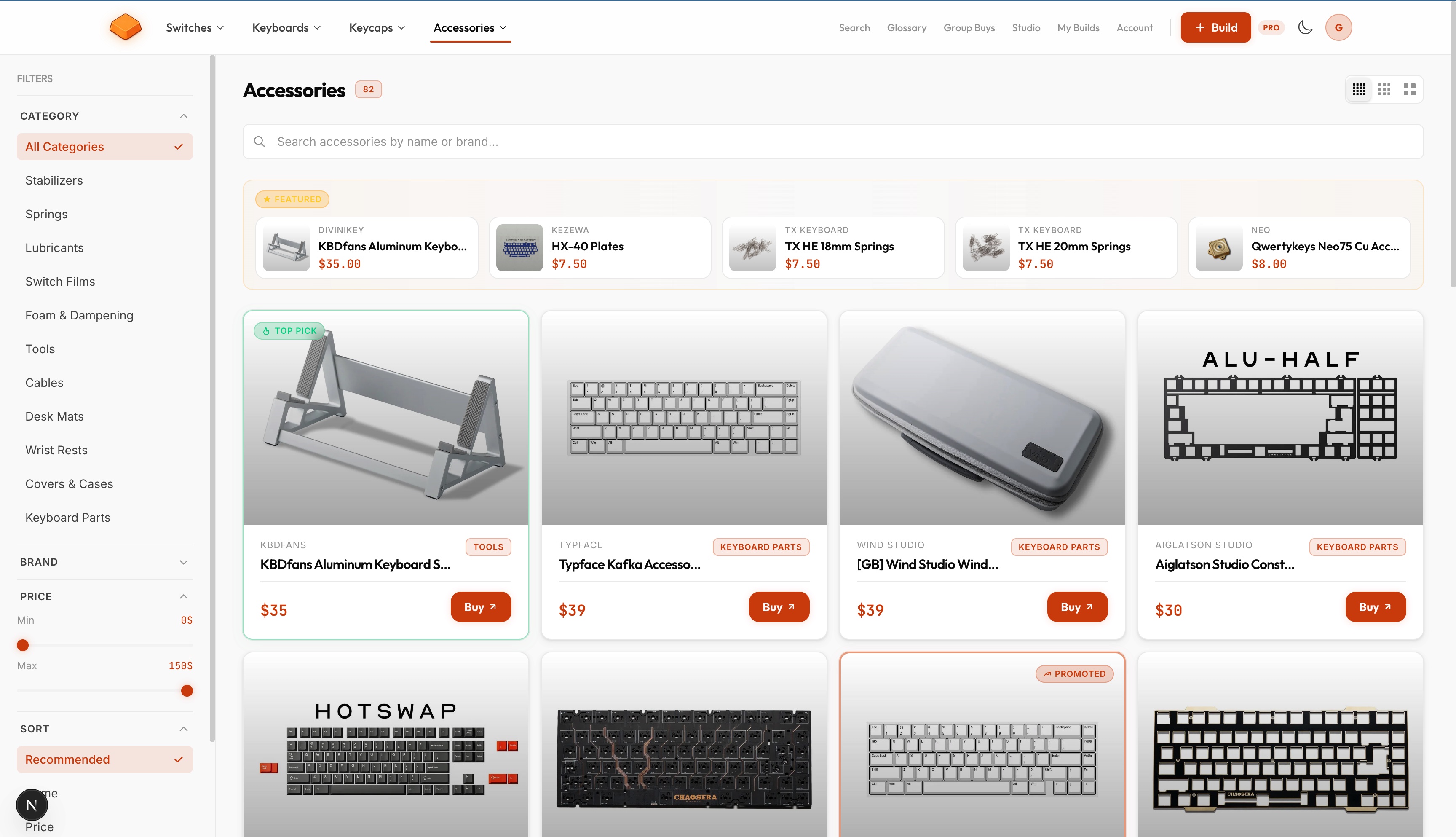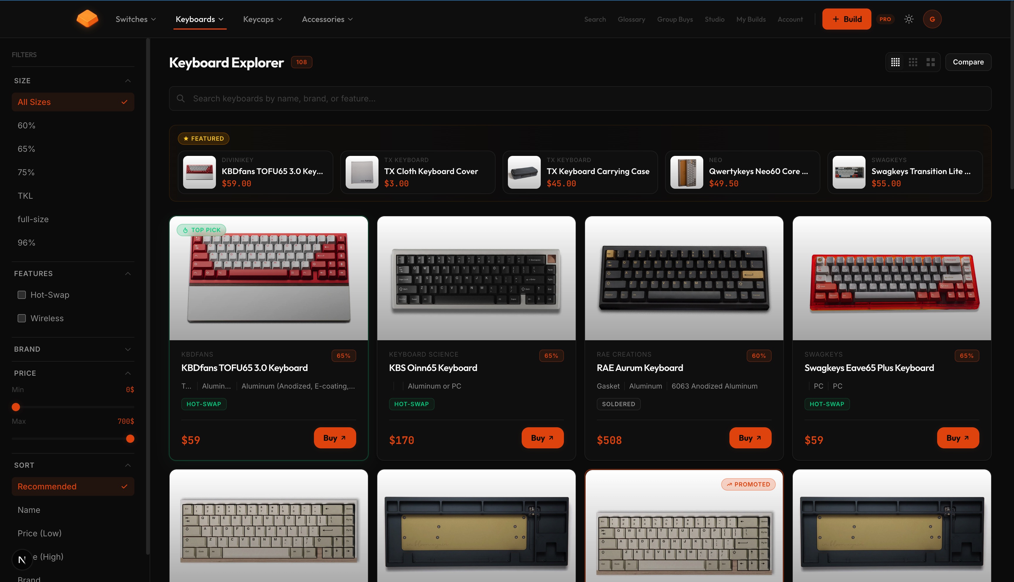 - Product explorer with 120+ switches, 40+ keyboards, 30+ keycap sets—all filterable by sound profile, type, and price