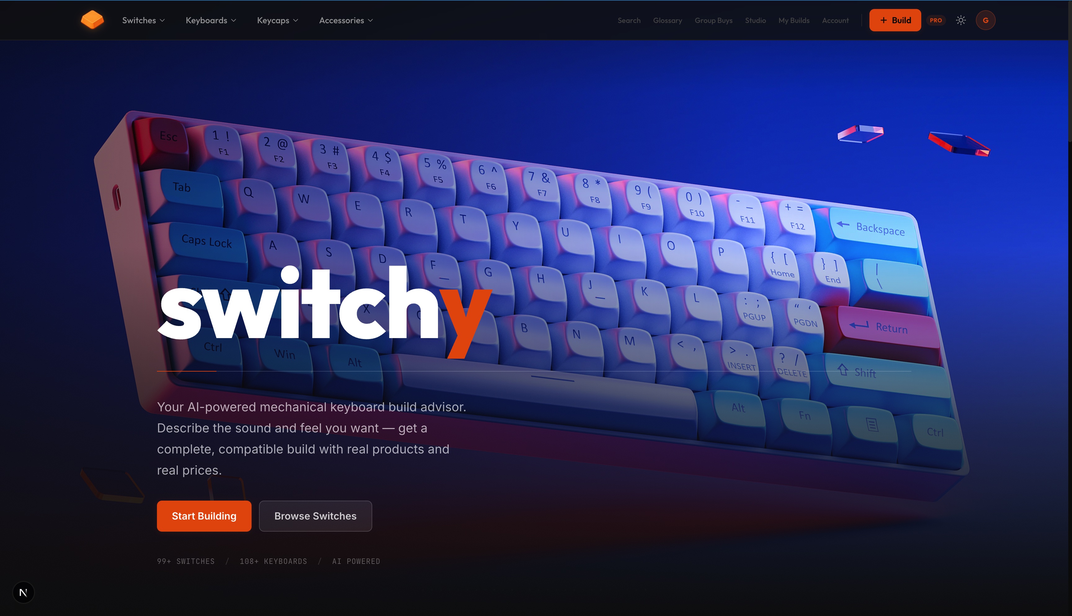 Switchy is an AI-powered mechanical keyboard build advisor with three paths to a complete build: