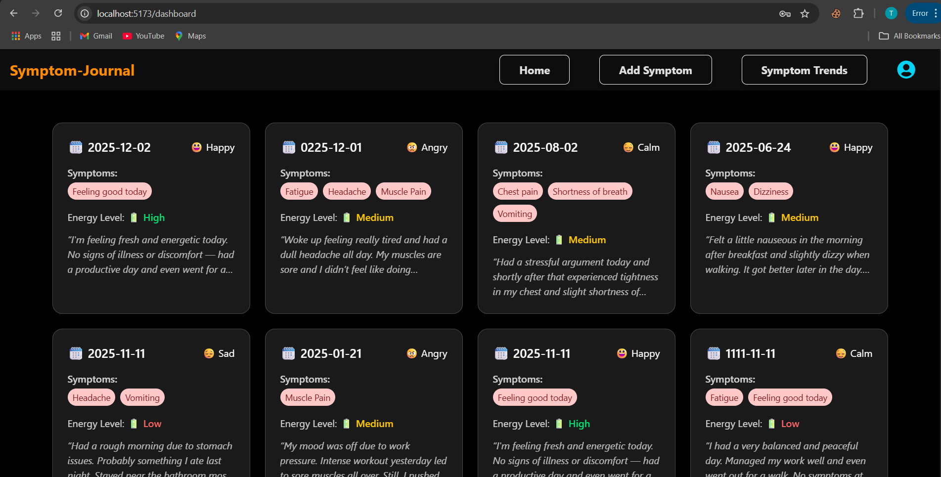 ** About the Project — Symptom Journal Symptom Journal is a web app to help users log daily symptoms, mood, and energy levels. It shows trends using charts so users can track their health over time.