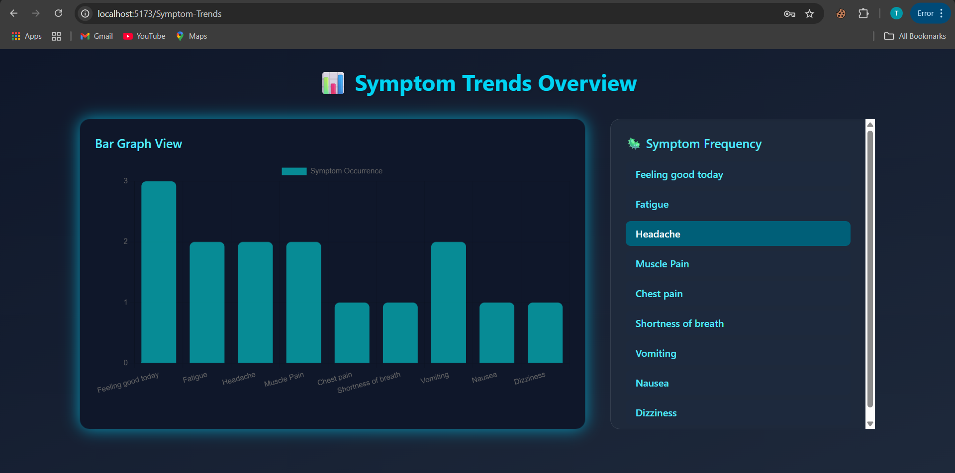 Impact: Helps users stay aware of their physical and mental well-being easily through daily symptom tracking. It allows early detection of health patterns, enabling users to take timely action and better self-care. Doctors can also use this data to understand patients' health history quickly, making consultations more accurate and efficient.