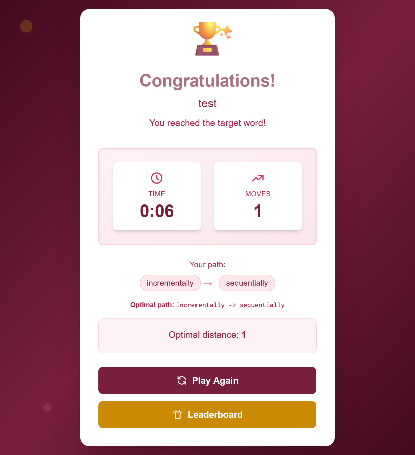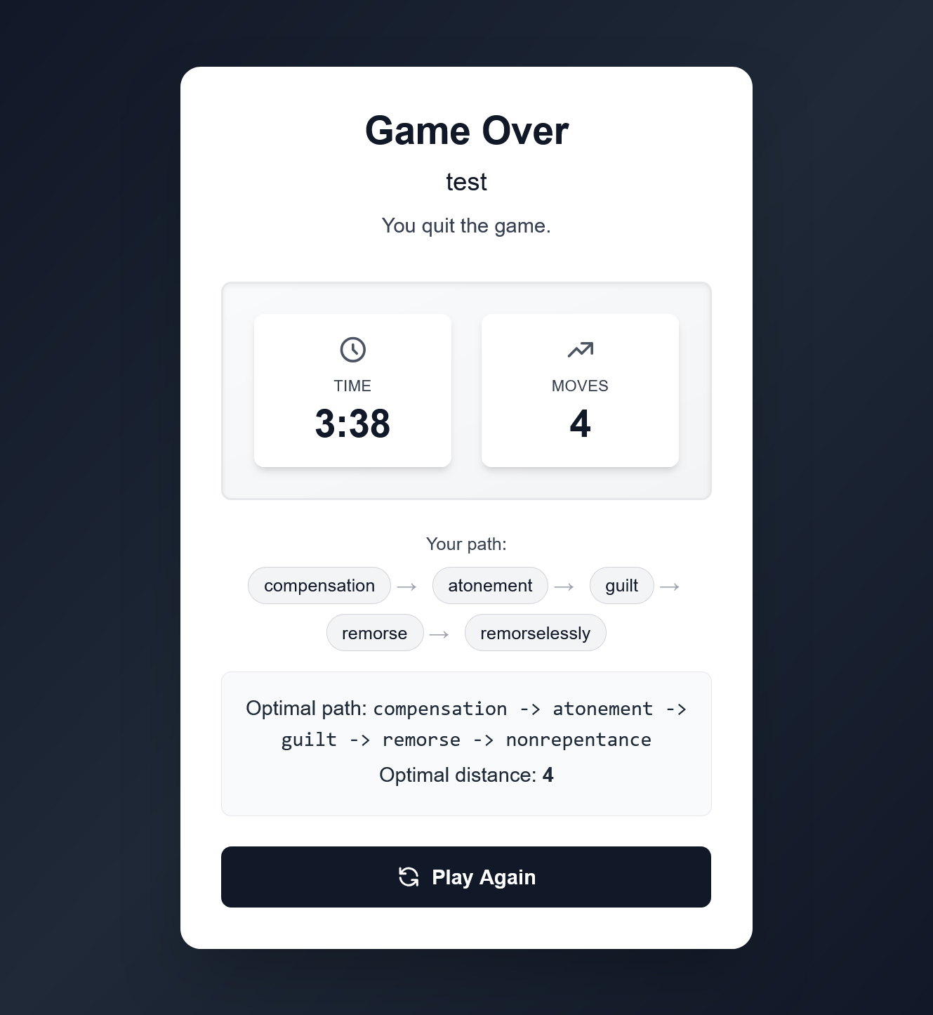 Players race against the clock, track their number of moves, and use a proximity meter, which takes into account of word similarity powered by text embeddings, to estimate how close they are to the target word. Players may backtrack to rethink their strategy, and successful runs are recorded on a leaderboard.