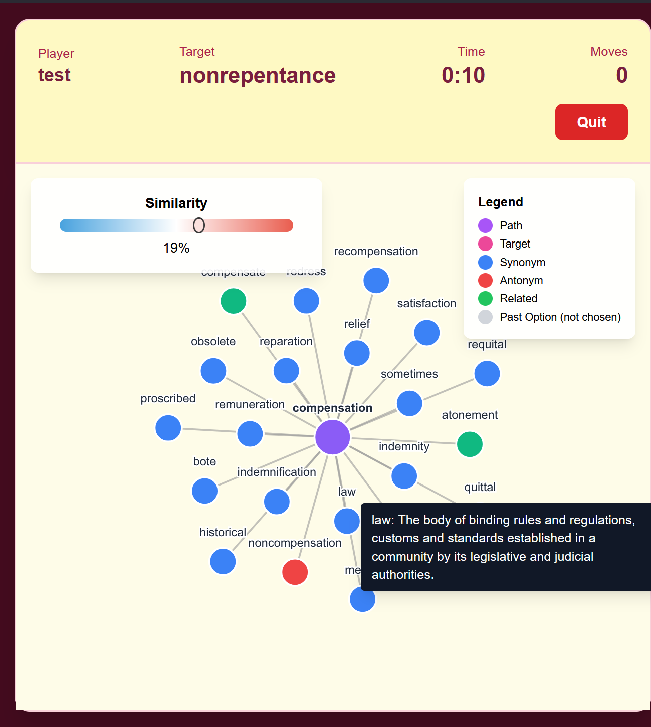 We modelled language as a semantic graph, where words are nodes connected through linguistic relationships. To estimate closeness between words, we used sentence transformers to generate AI embeddings, allowing us to compute semantic similarity in real time and power the proximity meter.