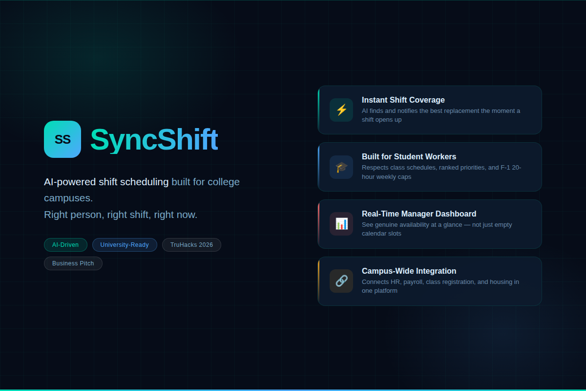 SyncShift is an AI-powered scheduling platform built for both managers and student employees. Workers input their classes, clubs, and commitments ranked by priority, and managers assemble schedules just like any other tool. The difference kicks in when something goes wrong — when a student cancels a shift, SyncShift's AI algorithm instantly scans every eligible employee's real-time availability, accounting for their class schedules, ranked priorities, and remaining work hours. It notifies the best match first. That person can accept or pass — if they decline, the next best candidate is notified automatically. No phone calls. No group chats. No coverage gaps. It also enforces the 20-hour weekly cap for F-1 international students automatically, eliminating the risk of accidental violations.