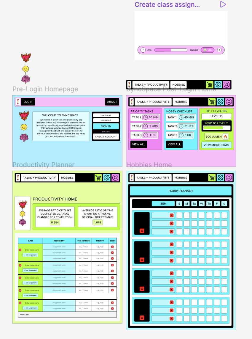 SyncSpace is a productivity and self-care app designed to maximize productivity and inspiration through interactive spreadsheets and a list of items that can be done as alternatives to doomscrolling for users to accomplish their personal and professional goals in small steps. The web app currently features an interactive task tracking spreadsheet with nested rows corresponding to a class where multiple assignments can be added and deleted for each class, a navigation bar linking to the productivity, hobby tracking, profile, settings, and shop pages, and a productivity dashboard with cards displaying priority school/work and hobby tasks, along with time estimates and buttons that navigate to the productivity and hobby tracking pages, respectively. This project will be continued after Bitcamp 2026 and will implement a hobby planner spreadsheet similar to that on the productivity page, a grid of options for micro-tasks for both school/work and for hobbies to suggest alternatives to problem behaviors like doomscrolling or rumination on OCD thoughts, a list of daily hobby tasks for users to focus on small, specific, and achievable goals, an XP leveling system, a currency (called Lumen) system where users can purchase cosmetic and social upgrades from a shop, and the integration of a screen time tracking API for the identification of trends in problem behavior occurrences. With the app's partial focus on mental health, the app will also feature an OCD thought tracker and manager where the user will reflect on why a specific thought is present, its cause, what delusions about identity and goals result from the thought, why the thought is destructive, and how the thought can be challenged. This project is inspired by my own experiences with OCD, with the goal of this app not precisely being therapy, but rather the development of a sense of identity outside of a user's OCD thoughts. This app should not feel like therapy, as if this was the case, it would go against the app's goal, which is for the user to develop a sense of identity outside of what they do in therapy. The app attempts to integrate both intrinsic and extrinsic motivation by reminding users of their goals and passions while also gamifying the user experience.