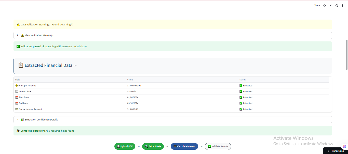 Extract key financial data (principal, interest rate, dates, interest amount)