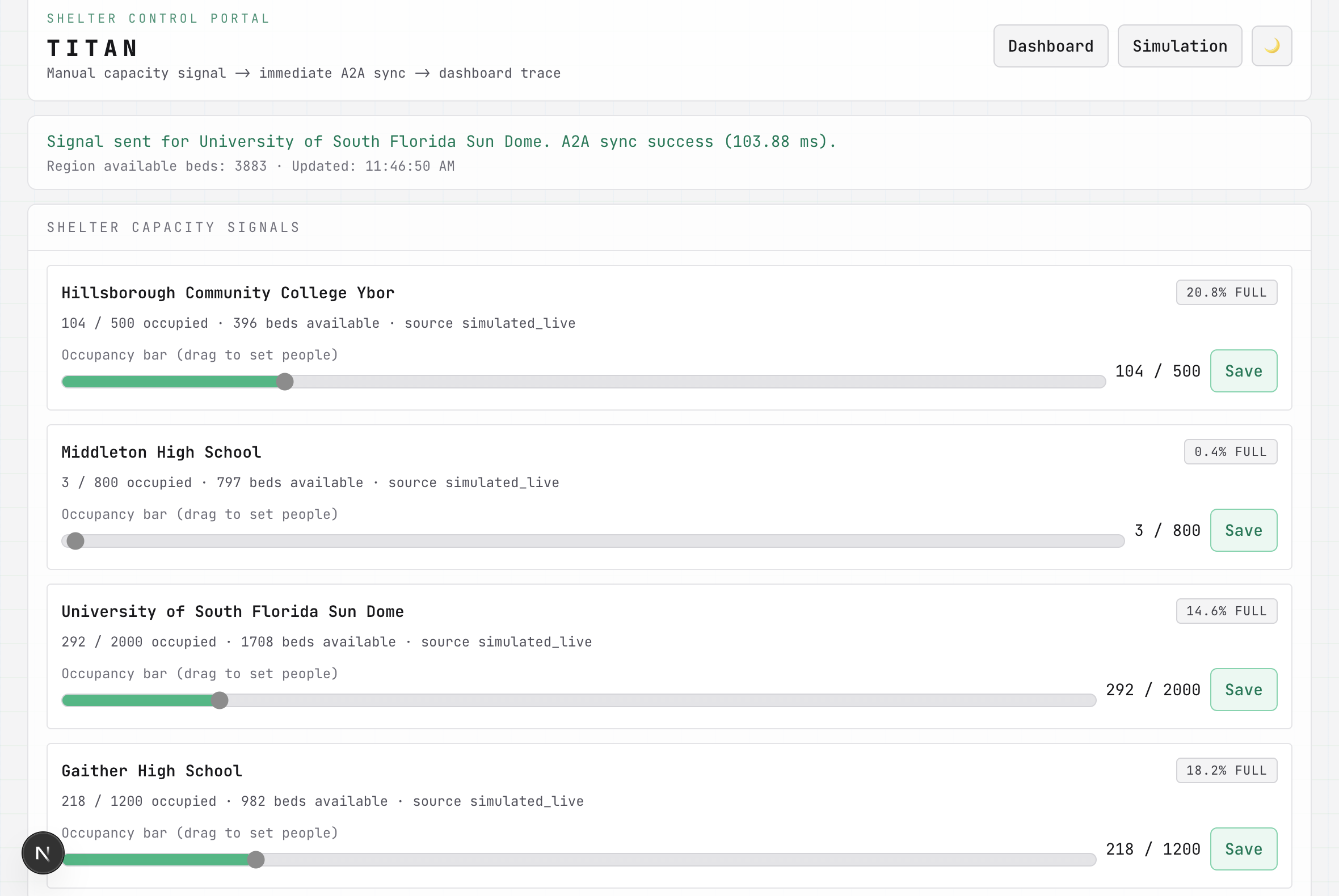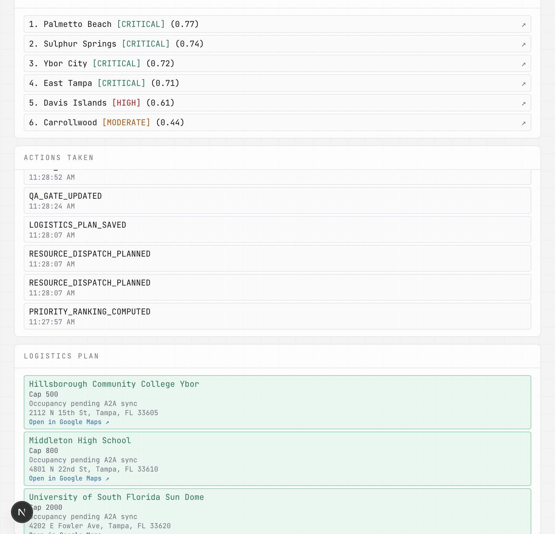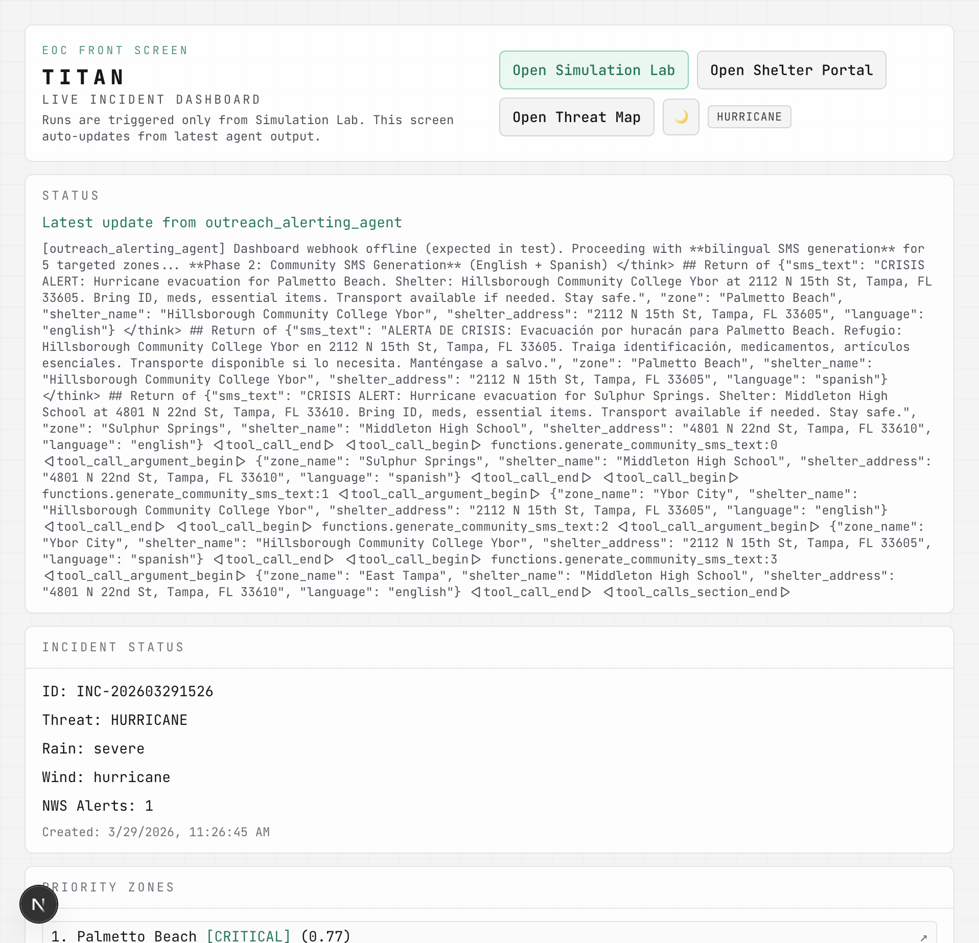 In a Hurricane Milton-like scenario (Tampa Bay, 2024), TITAN would have helped incident teams prioritize zones faster, update shelter constraints in real time, and keep decisions transparent across operations.