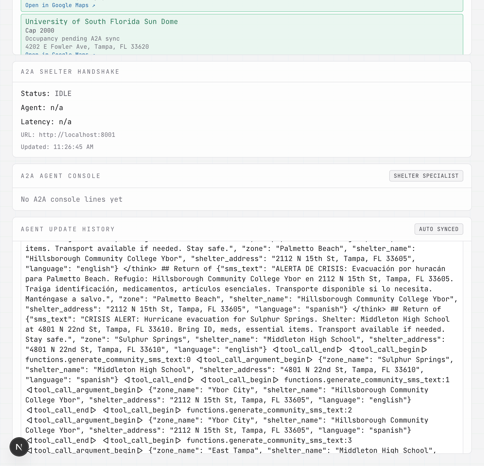 ParallelAgent+LoopAgentimplemented in core response pipeline. - A2A Interoperability: shelter specialist handshake via agent card discovery + one-shot tasking.