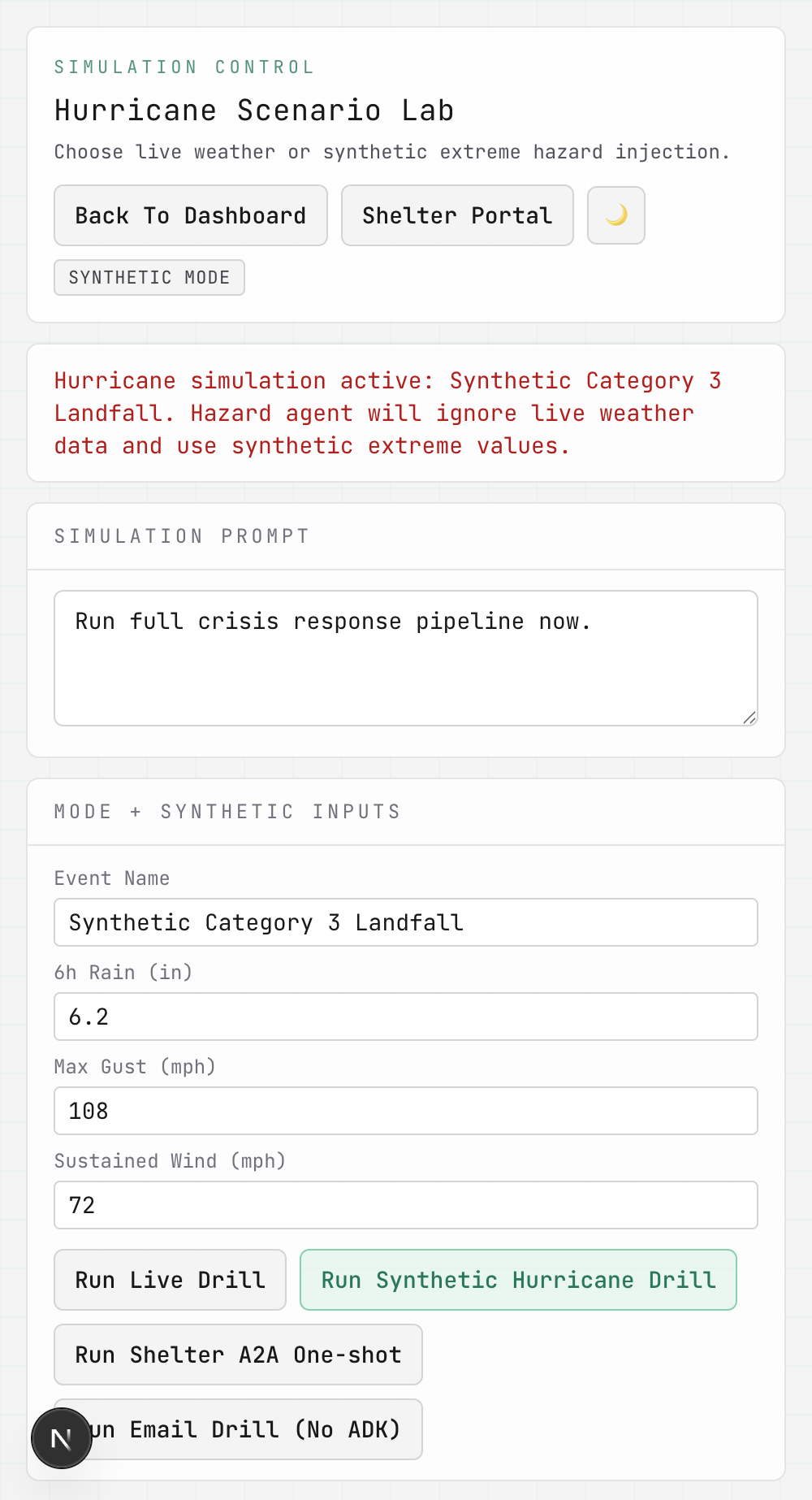 /landing-pagefor pitch/demo entry./simulationfor live vs synthetic drills./shelter-controlfor operator occupancy control (slider/progress + save)./dashboard for incident status, logistics, A2A trace, and live updates./threat-mapfor zone-level visual prioritization.