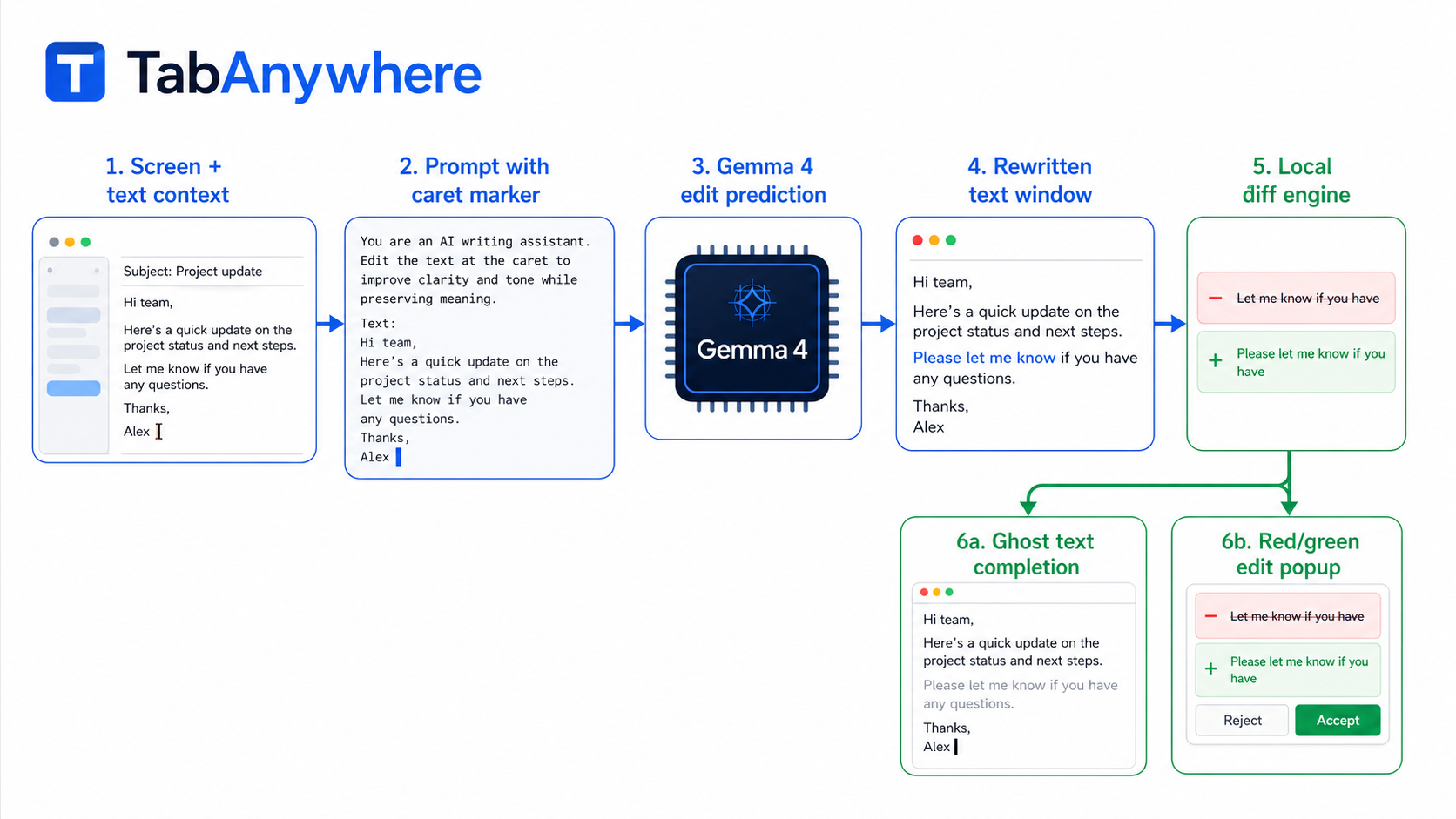 Longer term, Tab Anywhere should become a private, local assistant that follows you across apps and devices with capabilities to predict contextual intent via concrete actions like clicking or navigating, in addition to text manipulations.