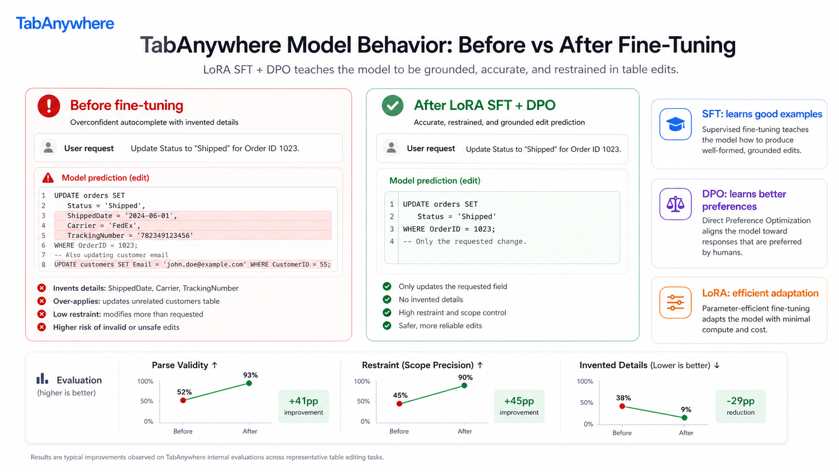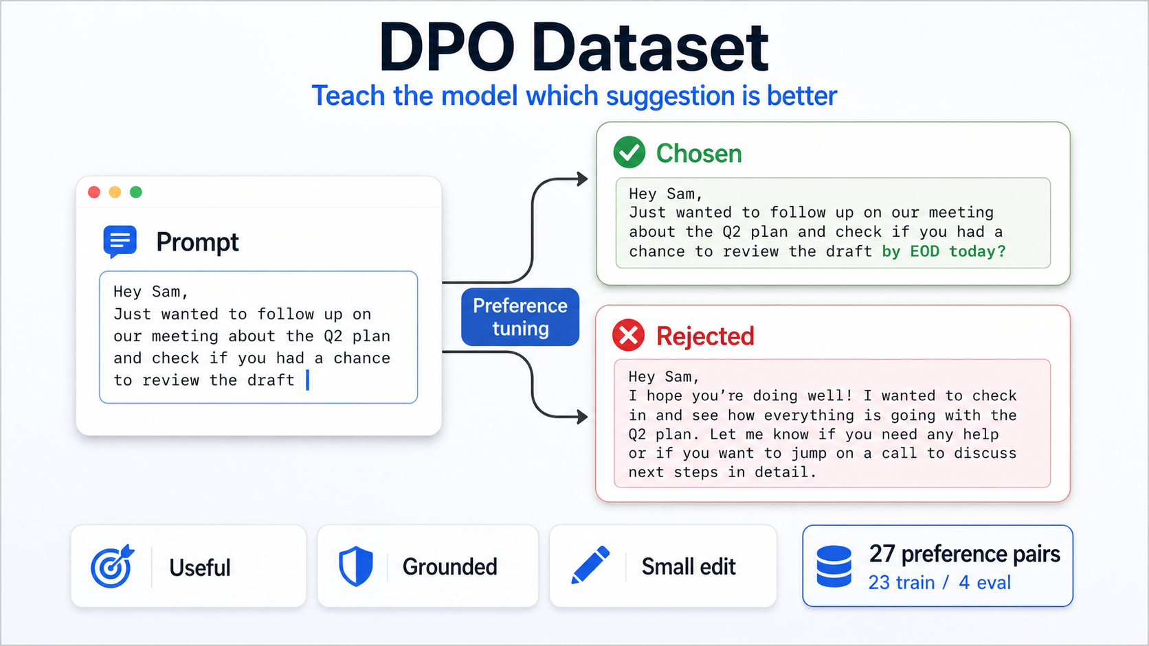 We also want stronger evals so we can compare the base model, SFT model, and DPO model across completion quality, edit quality, hallucination rate, and “would a user actually accept this?” score.