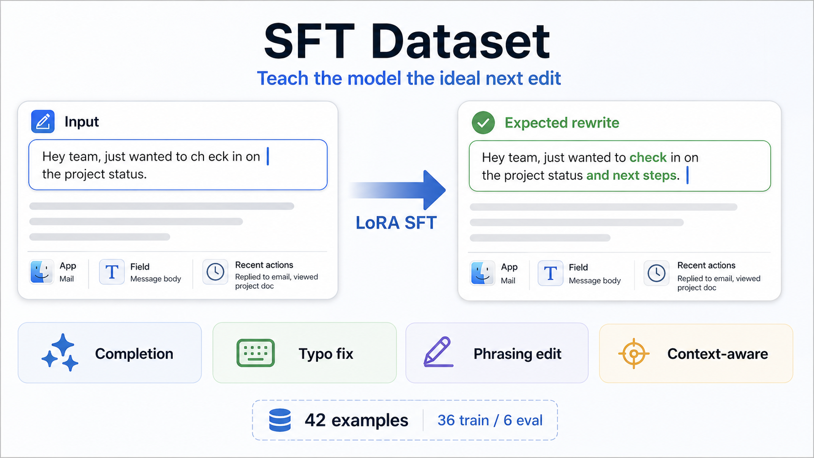We also built a training and evaluation pipeline around examples for completions, typo fixes, phrasing edits, and context-aware suggestions. Due to time constraints and privacy concerns, much of the data was synthetically generated.