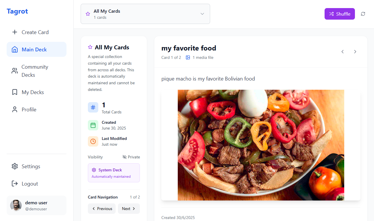 User Authentication & Profiles: Sign up, sign in, manage their personal profiles, including display name, username, bio, and avatar. Deck Management: Create custom digital decks, set their visibility (public/private), and organize them. Users can also manage system-generated decks like the "All My Cards" deck, which automatically collects all their created cards. Card Creation & Content: Add individual cards to their decks with titles, descriptions, and rich multimedia content (images, videos, and audio files). Card Viewing & Interaction: Browse cards within decks, navigate through them, and play embedded media directly within the application. Community Exploration: Discover and explore public decks created by other users in the community. Search & Filtering: Search and filter decks based on various criteria like title, description, and type. Main Deck Integration: Include personal decks in a "main deck" rotation for daily readings or focused study.