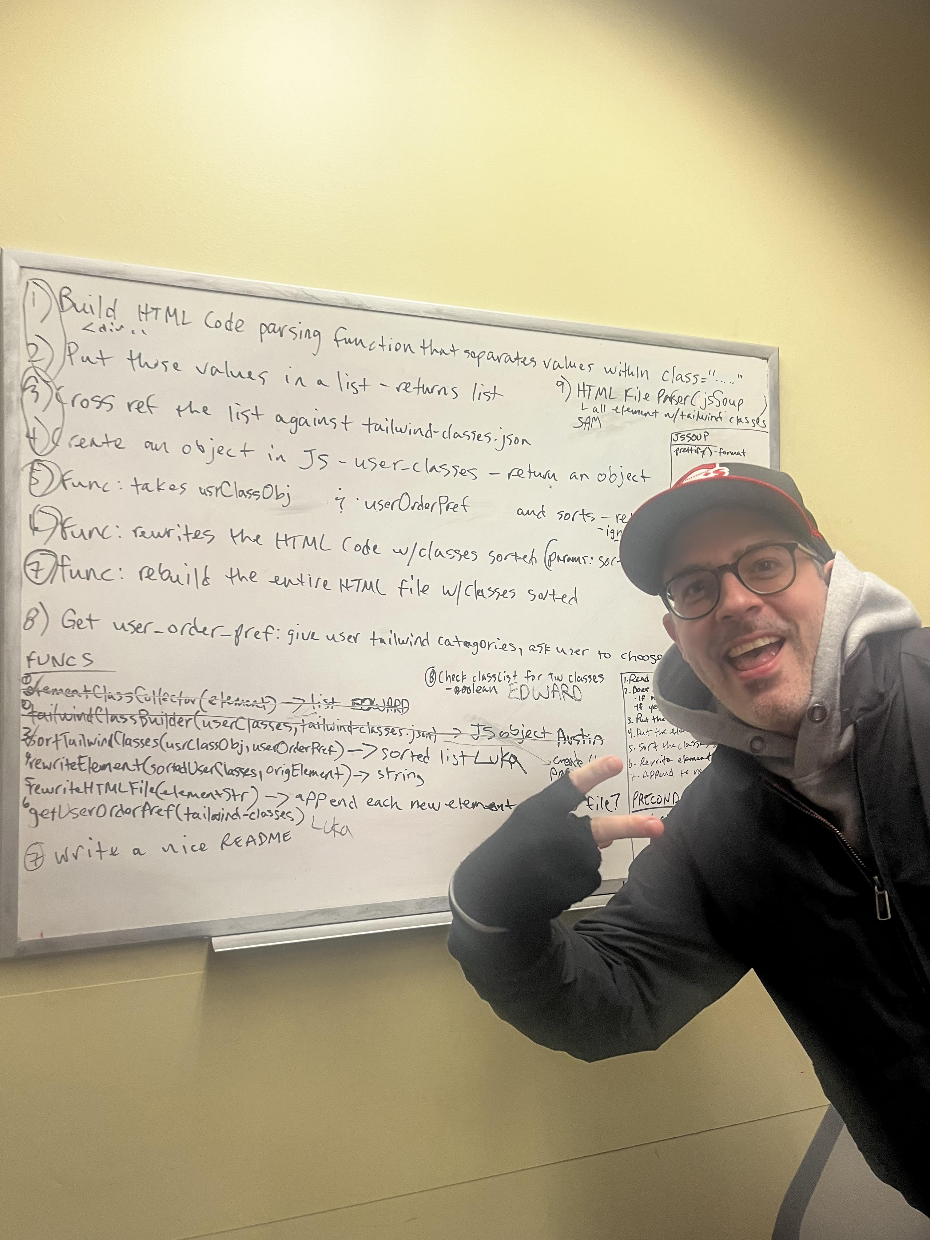 Everything! Considering how new we all are to Javascript, we are very happy to have a working application that improves the developer experience with Tailwind. We had to scramble to refactor the codebase after already coding for 12 hours, we kept cool heads and continued to work together and claw the project into a working state. This is a tool we can actually use, and the logic is there to turn this into a more user-friendly VSCode extension in the future.