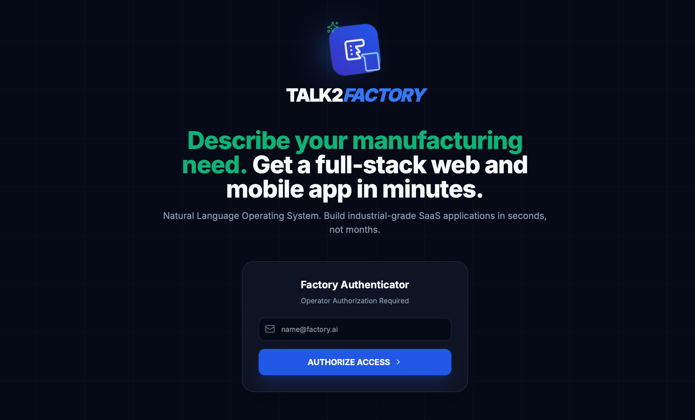 Talk2Factory turns natural language into production-ready manufacturing software. Users describe needs like predictive maintenance or quality monitoring, and the platform generates full-stack web and mobile apps with AI, dashboards, and alerts.