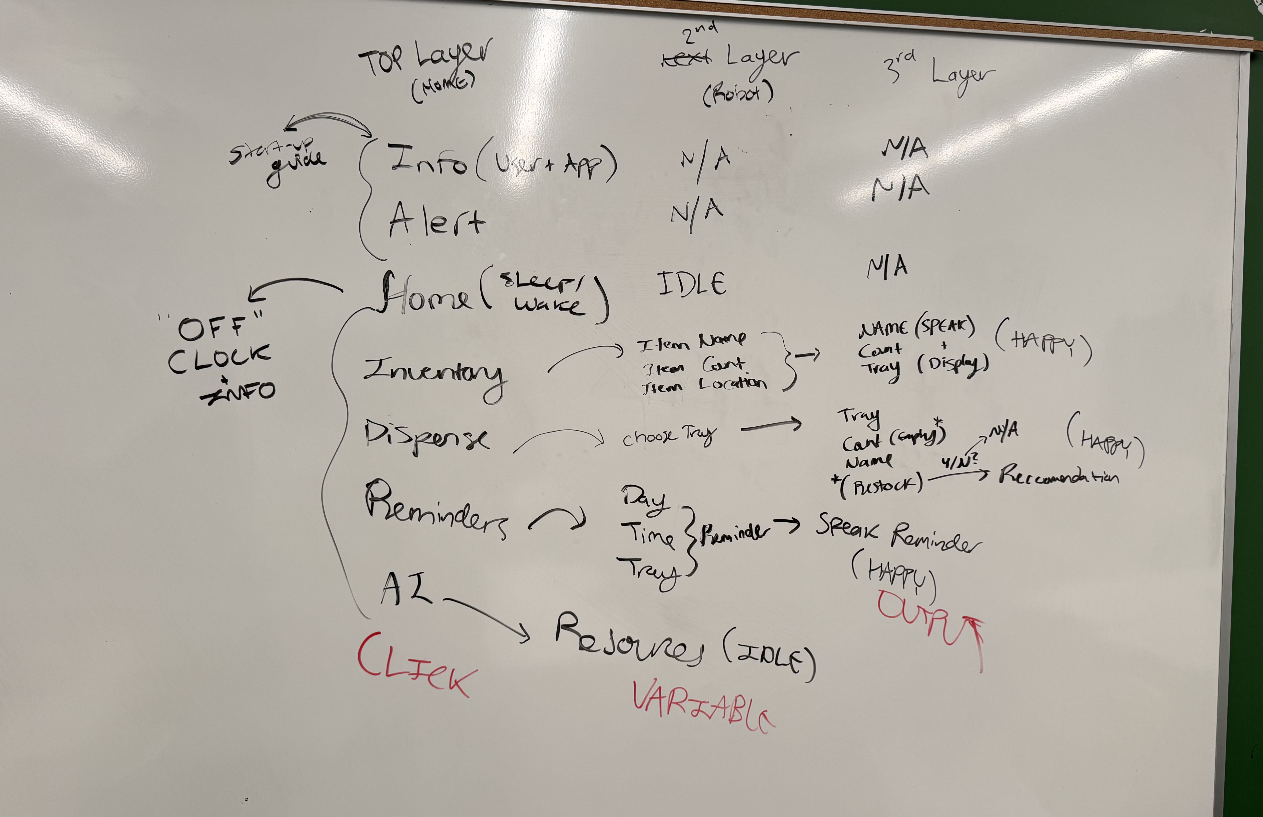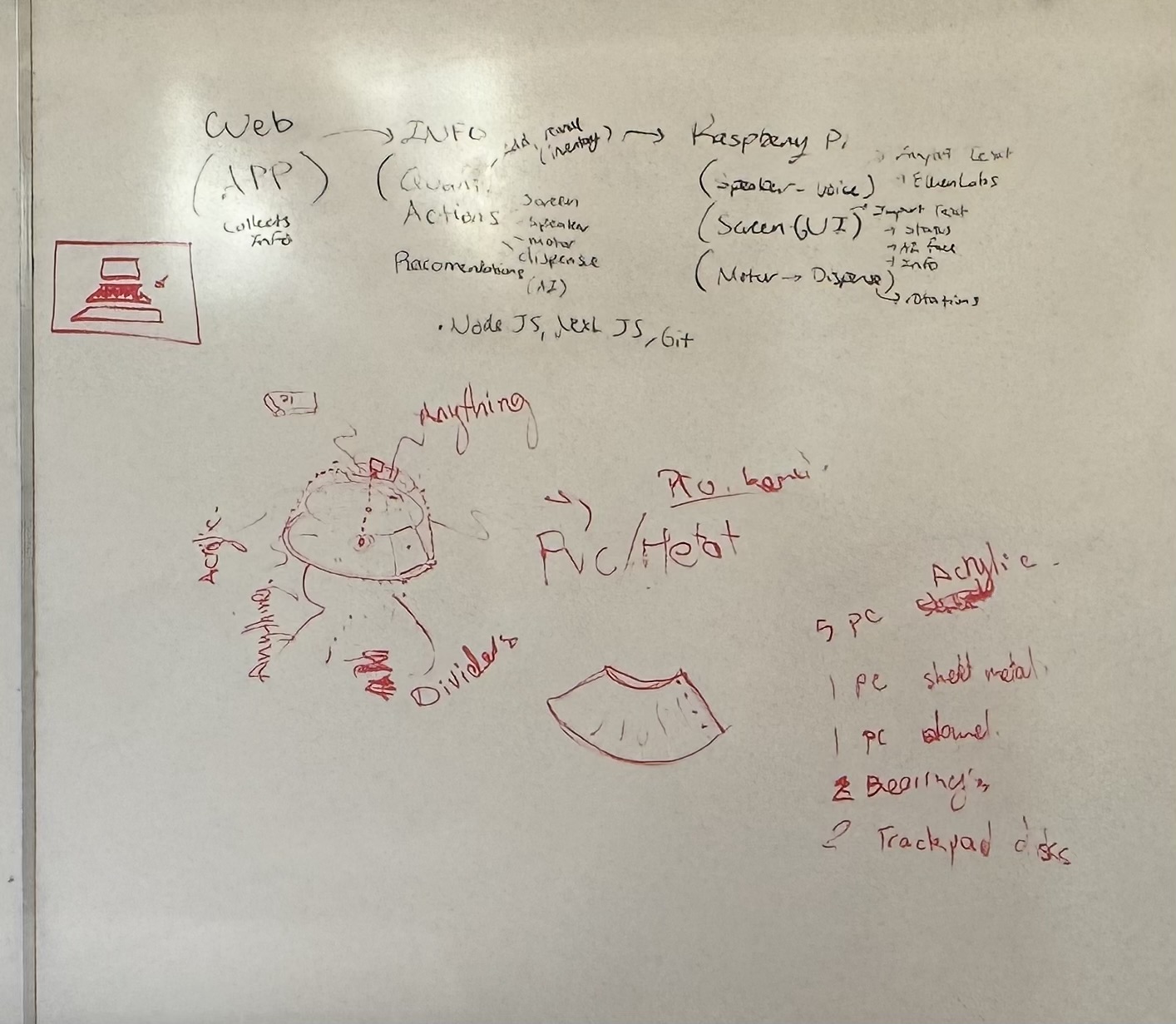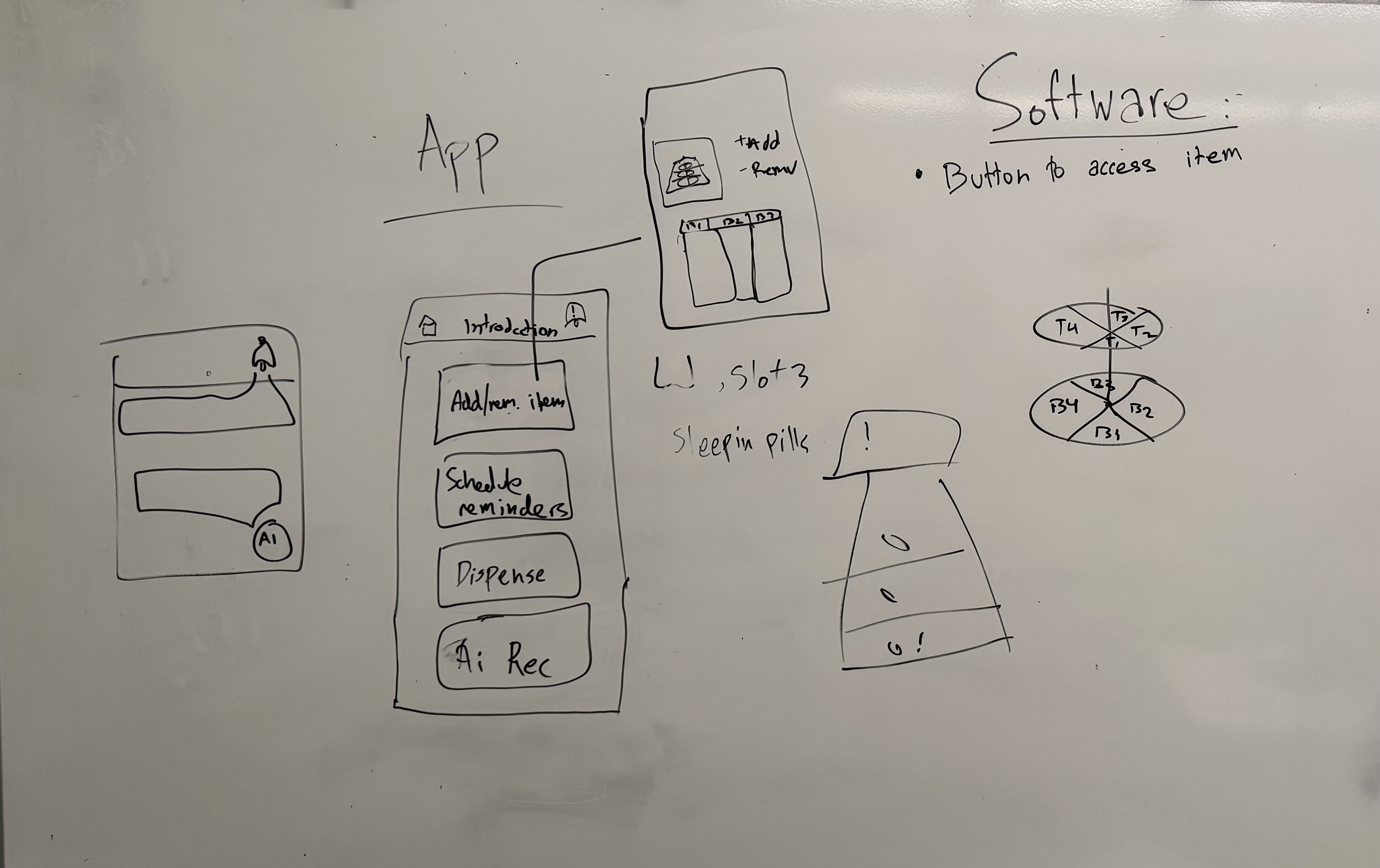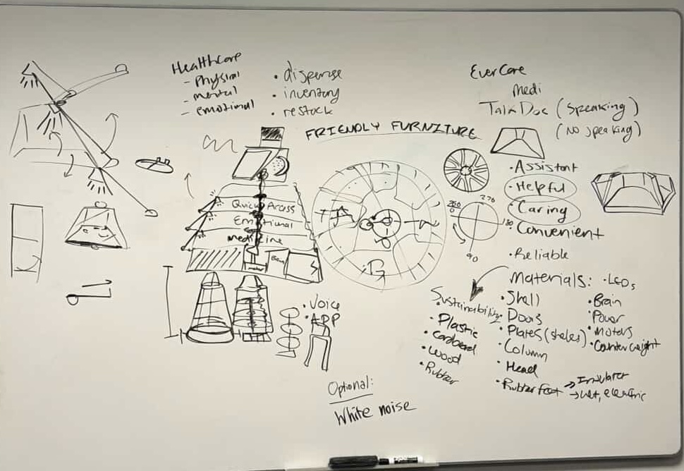 Thus, TalkDoc was born. Your Home or Work AI Assistant as the flagship model of our "Friendly Furniture" idea. Serving convenience with a smile, the TalkDoc (or Doc for short) was drafted up to be a two-fold product: an interactive app that could store information, send reminder, and serve as an AI agent as well as a physical robot that could self-manage inventory and dispense what you need when you need it!