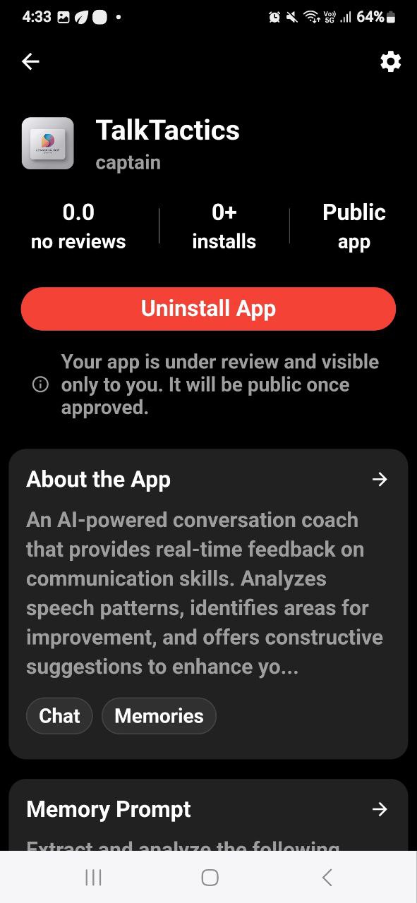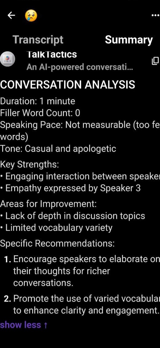 The idea for TalkTactics came from the increasing need to navigate social interactions effectively, whether in personal, professional, or casual settings. Many people struggle with finding the right words, maintaining conversational flow, or crafting responses tailored to specific contexts. TalkTactics aims to empower users to tackle these challenges by offering real-time conversational strategies and tips. Inspired by the versatility of human communication and the potential of AI, this app is designed to be a reliable assistant for enhancing every interaction.
