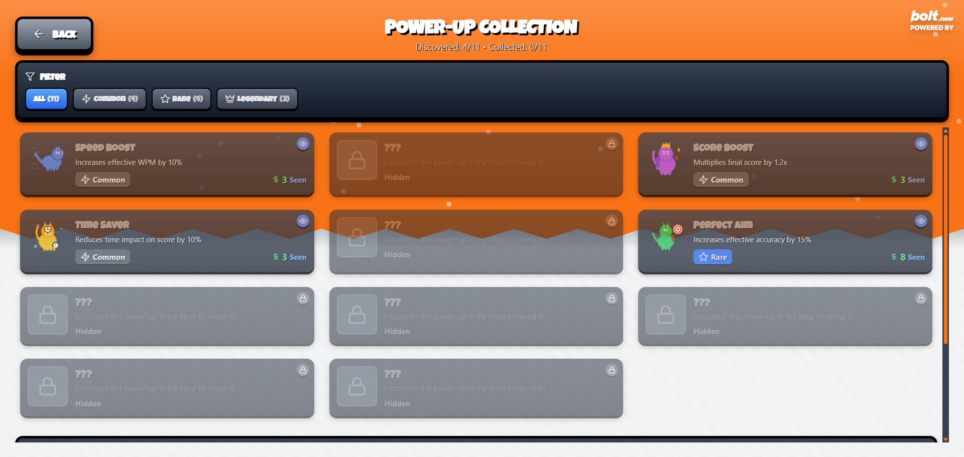 Collection The power-ups have different rarities which you can find by going to the collection screen where you can view power-ups you have encountered and collected.