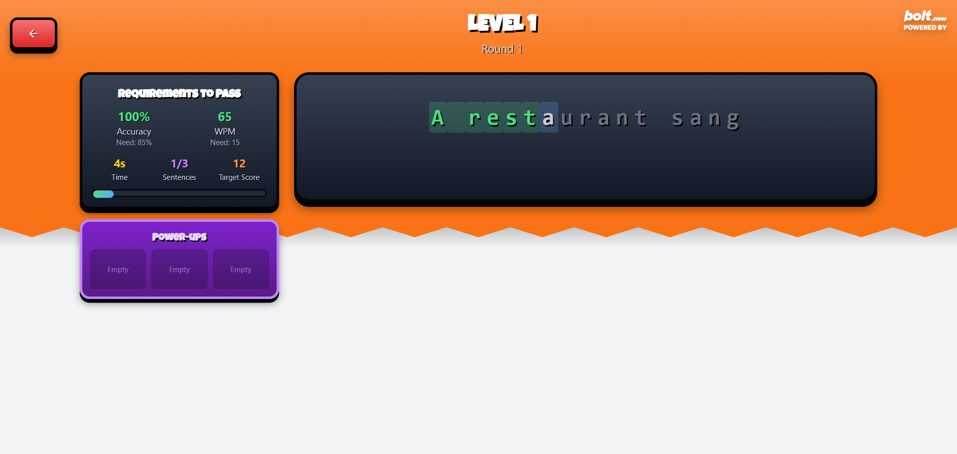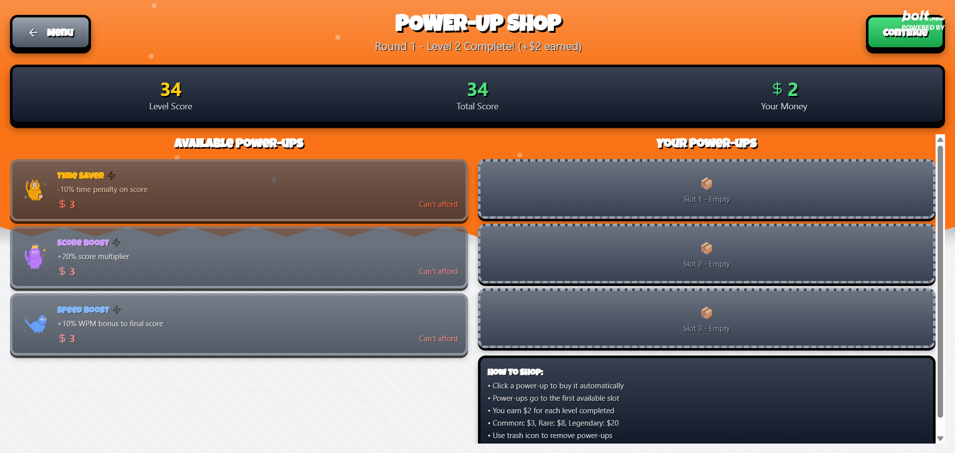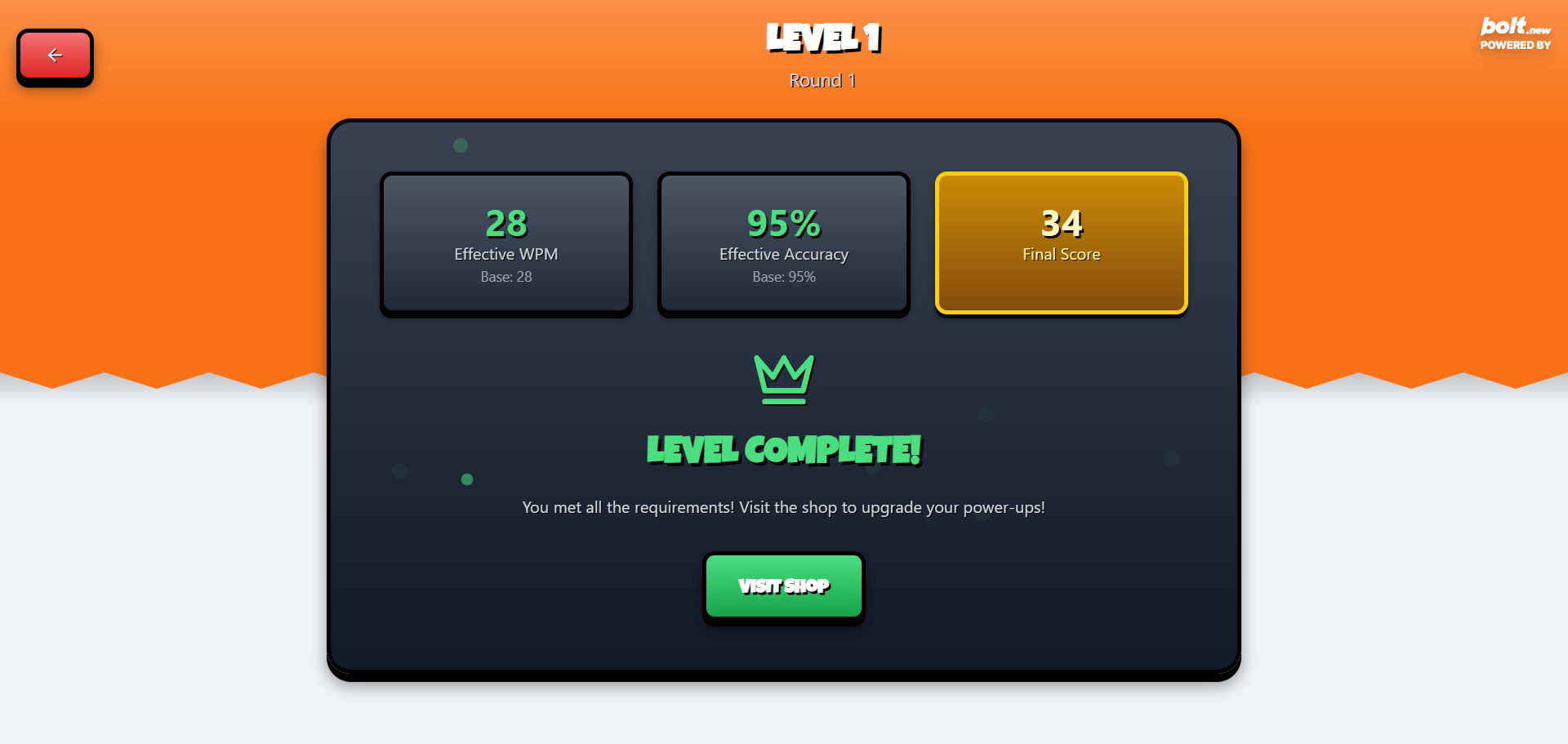 Game The game consists of five rounds of sets of three levels with increasing difficulties. Each level has score requirements which are determined by accuracy and speed To beat later levels you also have to use the money you earn each level to purchase power-ups in the shop which appears at the end of each level.