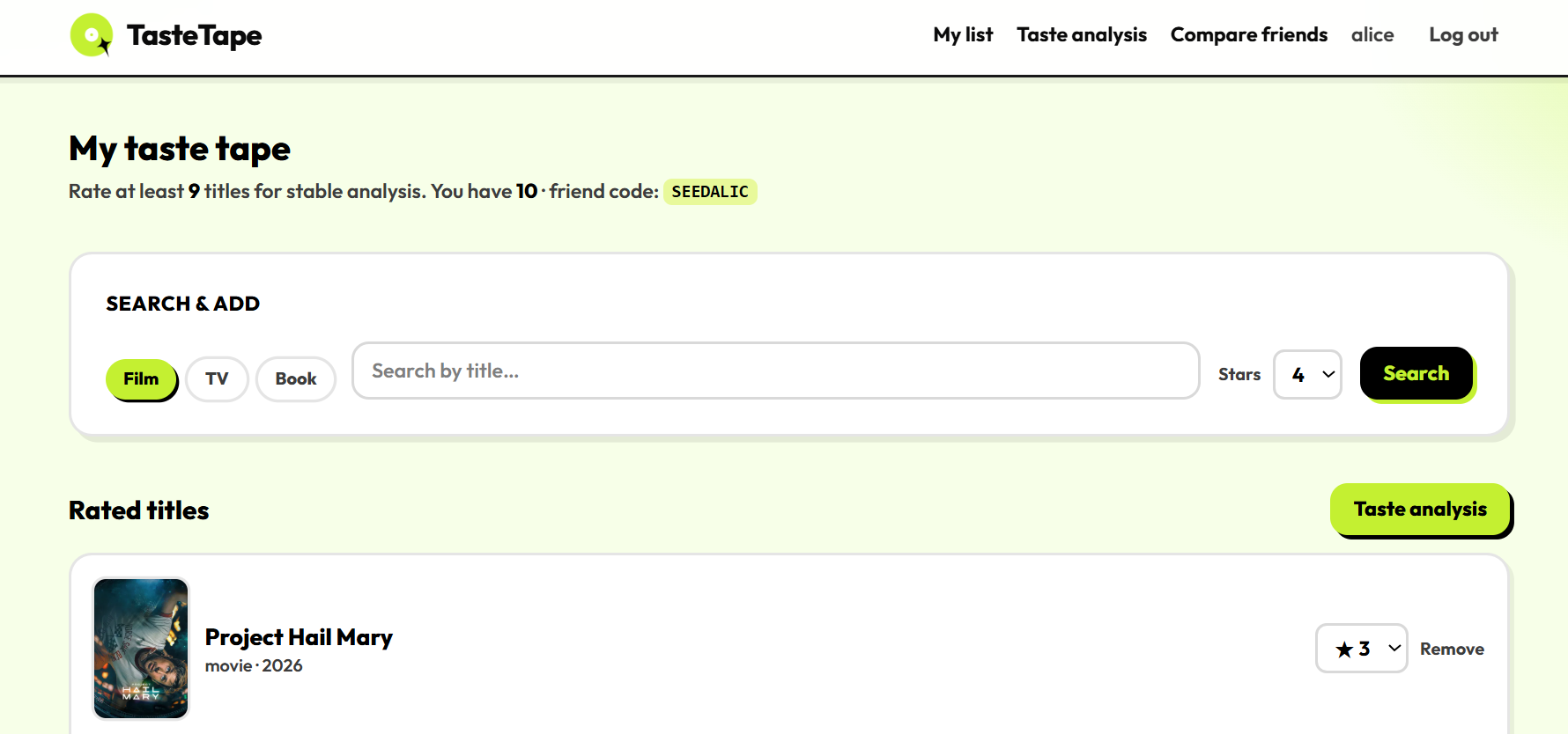 - Frontend: React 19, React Router, Vite, Tailwind CSS v4, and html-to-image for recap capture. ##Challenges we ran into Unifying catalog entries from multiple providers into one model and wiring them cleanly to cache and ratings. LLM responses are not always perfect, so we relied on schema validation, placeholders, and strict server-side filtering so on-screen recommendations stay tied to real data. Exporting recap images when poster URLs and CORS can break captures—handled with options like cacheBust and crossOrigin where needed. Accomplishments that we're proud of A single app flow across books, movies, and TV—from search and library to analysis and compare. Using Gemini as structured JSON combined with domain logic (profiles, candidate gathering, overlaps)—a product feature, not a generic chatbot. Friend-code comparison and a compare visibility toggle that respect privacy. Visual recaps and export so people can share “my taste in one image.” What we learned Prompts + schemas + server validation are what make LLM features shippable in a real UI. For media metadata, a cache layer and keys like provider + externalId pay off quickly for recommendations and compare. Even in a hackathon, types (Zod, Prisma, TypeScript) help wire APIs and UI fast with fewer surprises. What's next for Taste Tape Social: Friend lists, compare history, notifications. Data: Broader locales/languages; status like watching or planned. AI: Tune recommendations from feedback; lower latency and caching. Product: Mobile-friendly web or PWA; Open Graph images or server-rendered recap cards for sharing.