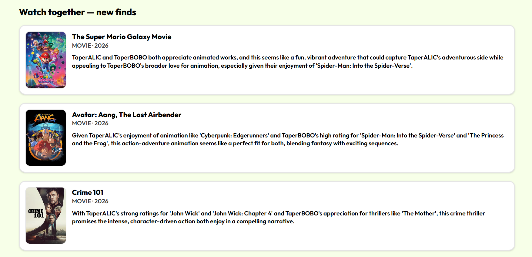 - Compare with friends: Enter friend codes to compare with several people at once—shared favorites, new things to watch together, and picks from each other’s libraries (subject to compare visibility settings).
