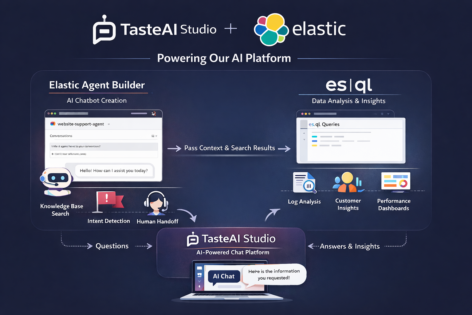 TasteAI Studio is a production-grade conversational AI platform for building, deploying, and scaling intelligent bots on your website—powered by Elastic ES|QL and Elastic Agent Builder, where each chatbot is backed by a dedicated Elastic agent with indexed documents for semantic search, intelligent query answering, and intent-based human handoff detection, enabling reliable, observable, human-in-the-loop workflows from day one.