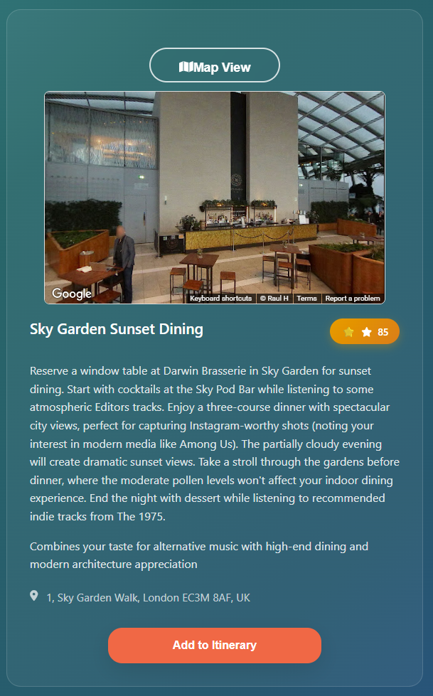 The platform demonstrates the power of LLM + Cultural Intelligence + Google Maps synergy: Qloo's Taste AI™ maps your preferences across domains to discover unexpected cultural connections, while Claude AI synthesizes this cultural insight with real-world data to generate experiences that genuinely excite you because they align with your unique cultural fingerprint and are optimized for the best environmental conditions thanks to Google Maps Platform data.