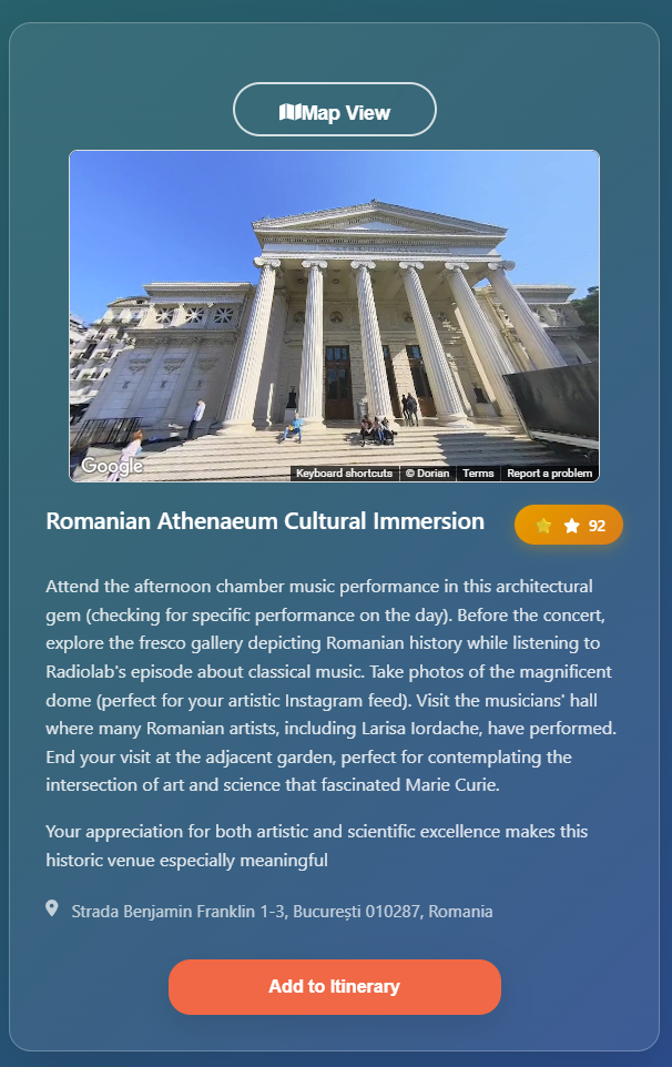 - Routes API Integration: Improve activity generation by checking the time needed to travel from one activity to the next using Google Maps routing
