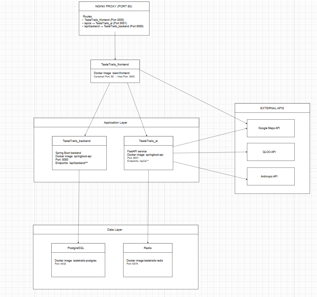 I designed TasteTrails as a microservices architecture with three core components: